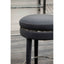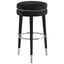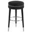 Grey velvet forms the rounded seat of this bar stool in thick padding. Renewable rubberwood legs are coloured to match with the muted upholstery. Each angled leg features a silver cap cover on its pointed foot which contrasts with ring footrest and detailing and gives a tonal counterpoint to the otherwise discreet accent.