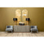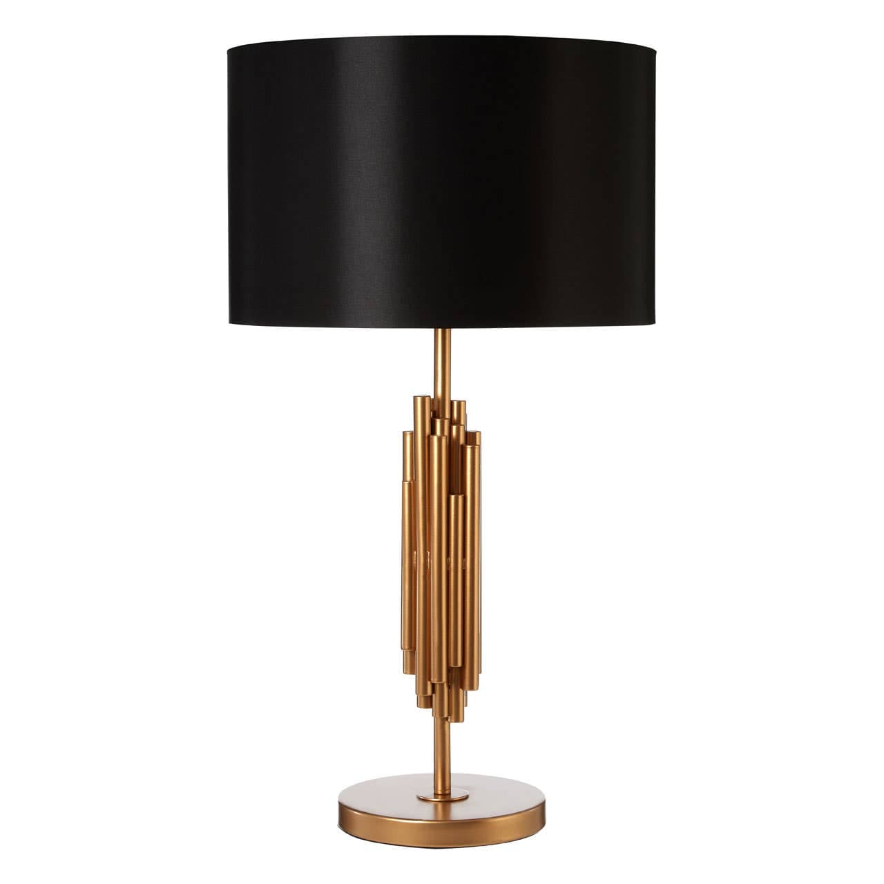 The table lamp is a modern statement piece, the champagne gold metal stem features an array of asymmetrical, supported by a sturdy round base. The black fabric drum shade rests atop the sculptural base and emitting a warm, ambient glow.