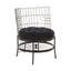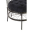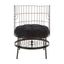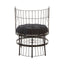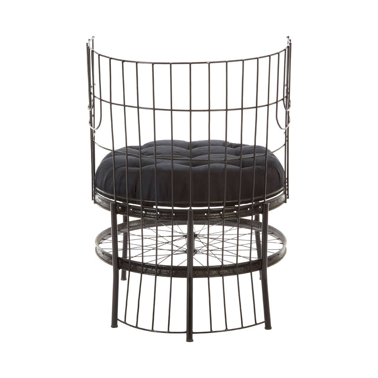 The Mantis chair is designed in a distinctive cage style with a base that resembles the spokes of a bicycle wheel. The unique design is created from strong iron with a sleek black finish coordinating with the fabric upholstery.