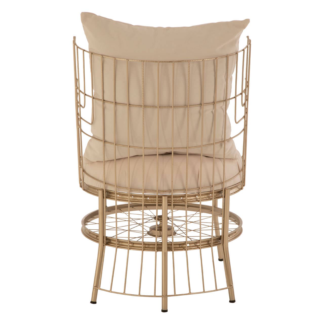 The Mantis chair is designed in a distinctive cage style with a base that resembles the spokes of a bicycle wheel. The unique design is created from strong iron with a luxurious champagne gold finish coordinating with the fabric upholstery.