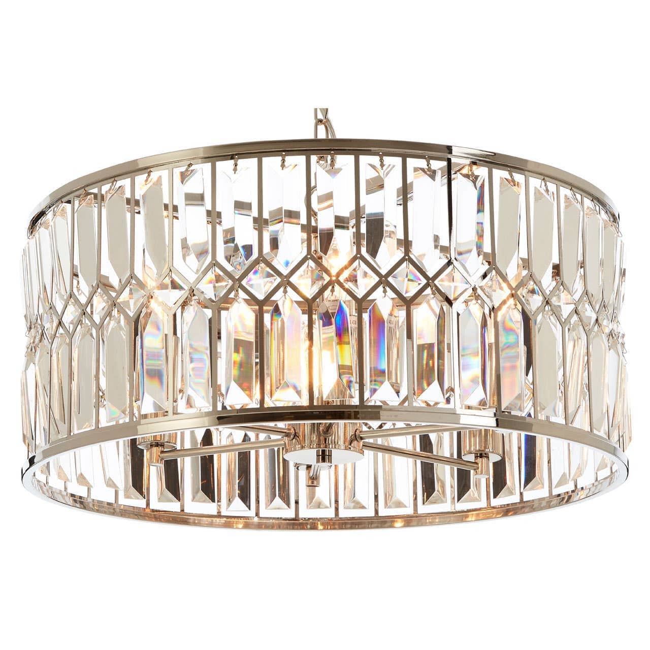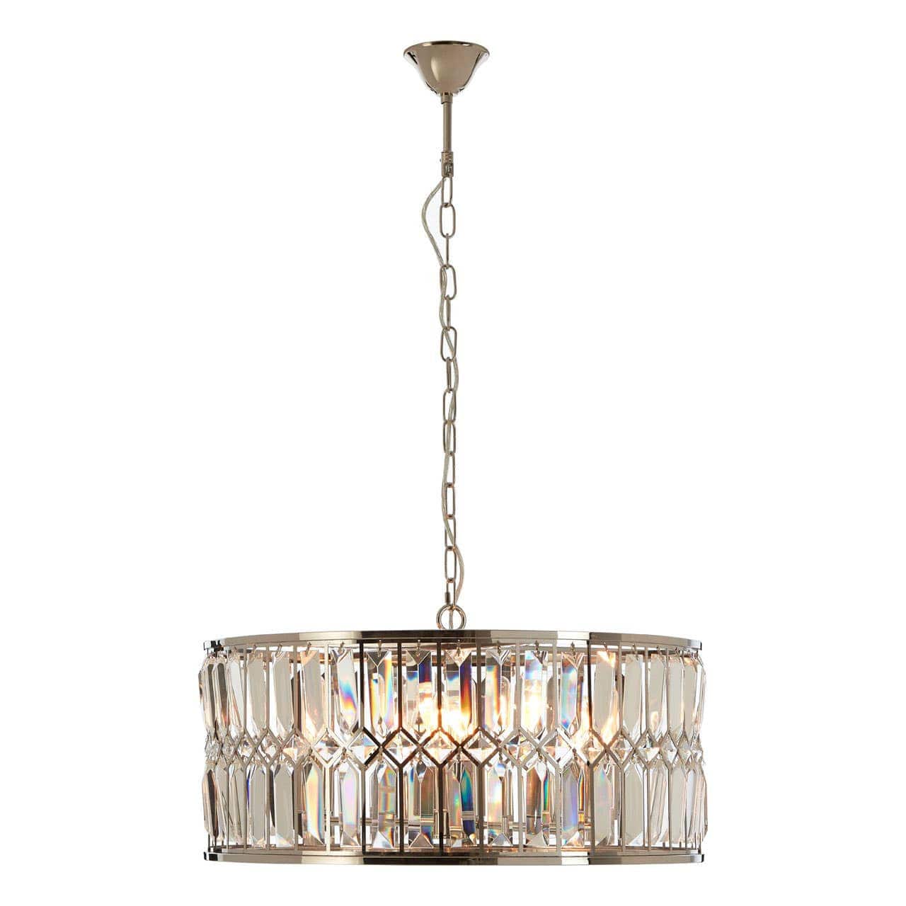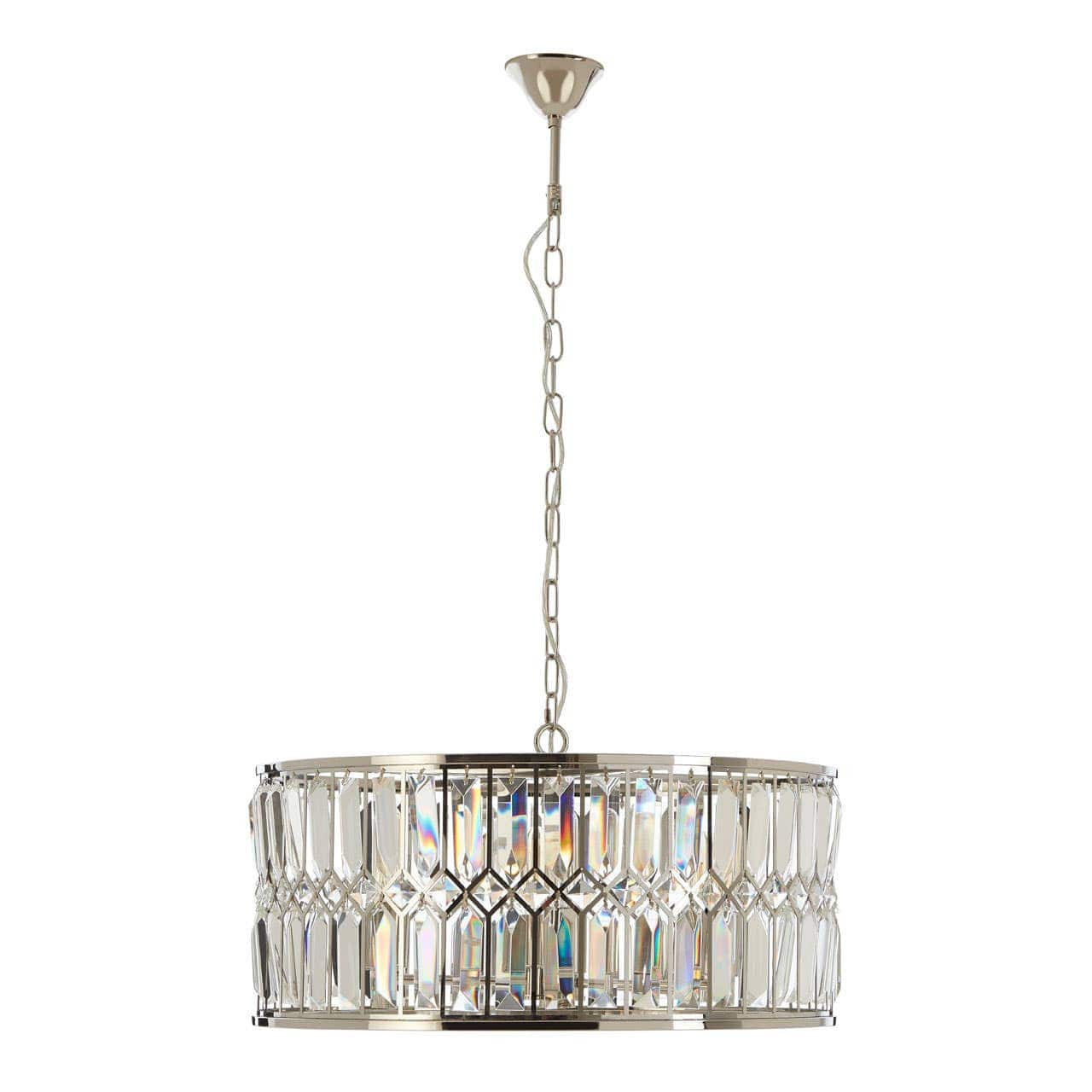 Supported by a strong frame created from stainless steel, the chandelier boasts a muted nickel plating, harmonizing with the clear crystal glass. A simplistic criss-cross design adds a decorative geometric element to the chandelier's centre and counterpoints its rounded form.