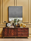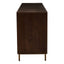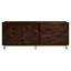 This sideboard offers ample warmth with acacia veneer finish frame featuring a herringbone pattern in light and dark brown tones. Offering ample storage, the drawers and shelves are complemented with antique brass finish handles that coordinate with sleek legs enhancing luxe sophistication.