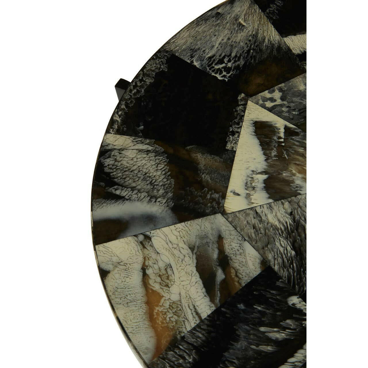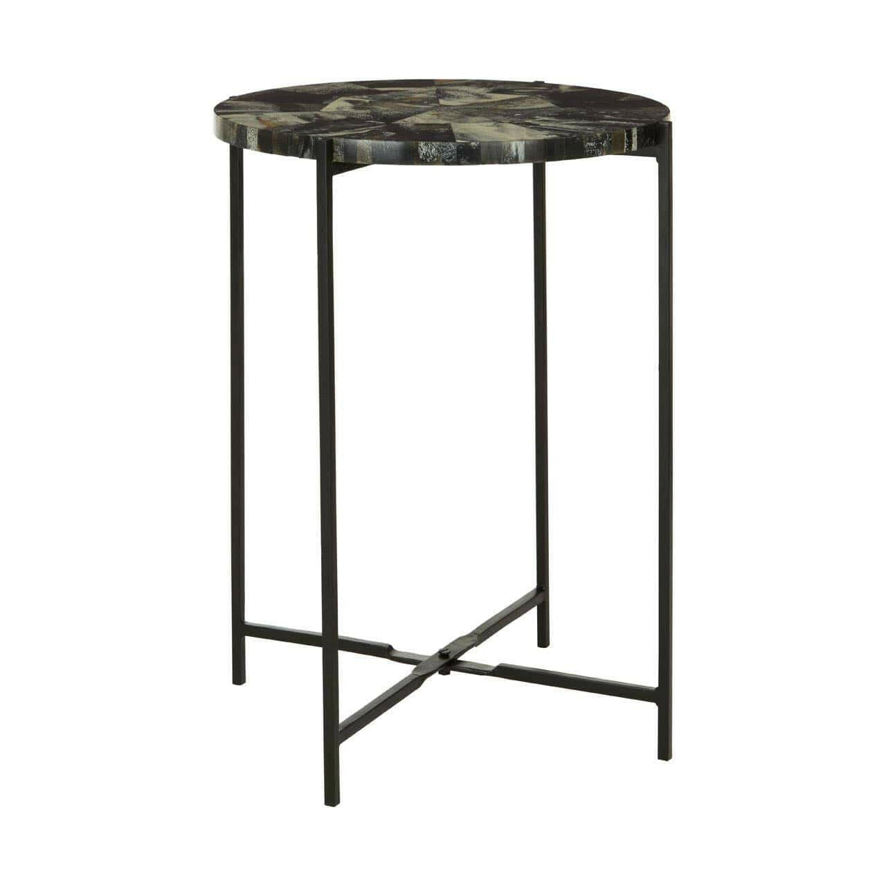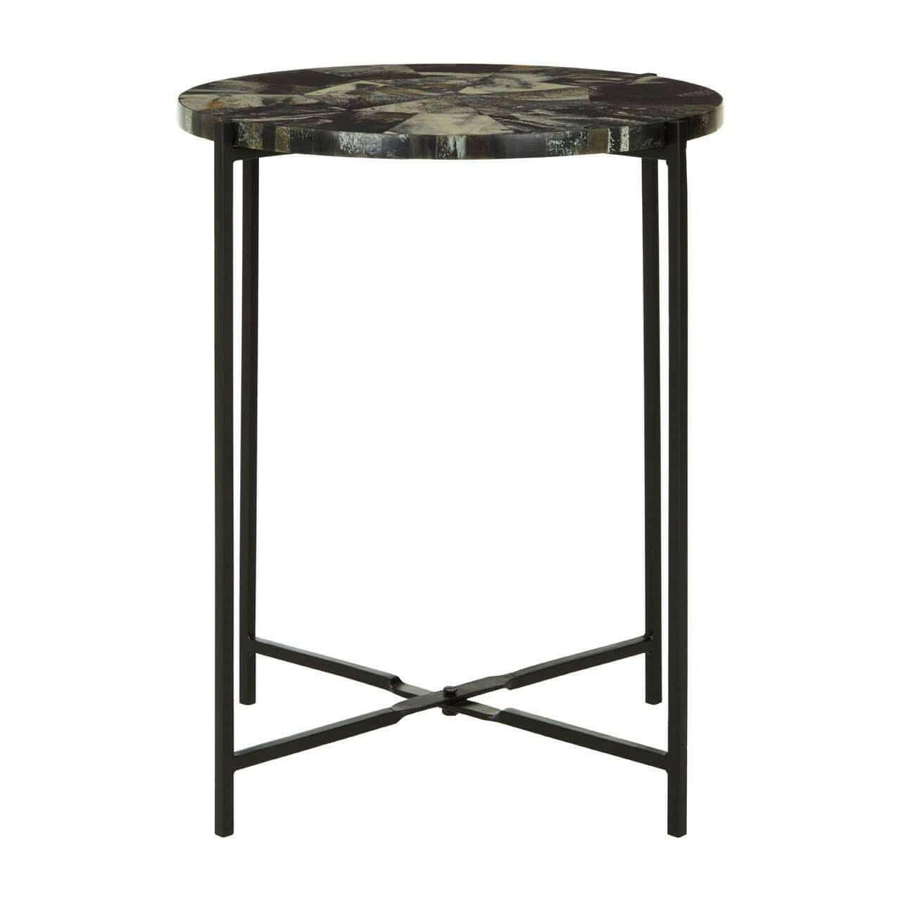 The Marlox table sports minimal legs made from black iron with intersecting lines at the lower section. Its resin covered top displays a variety of moody colours.