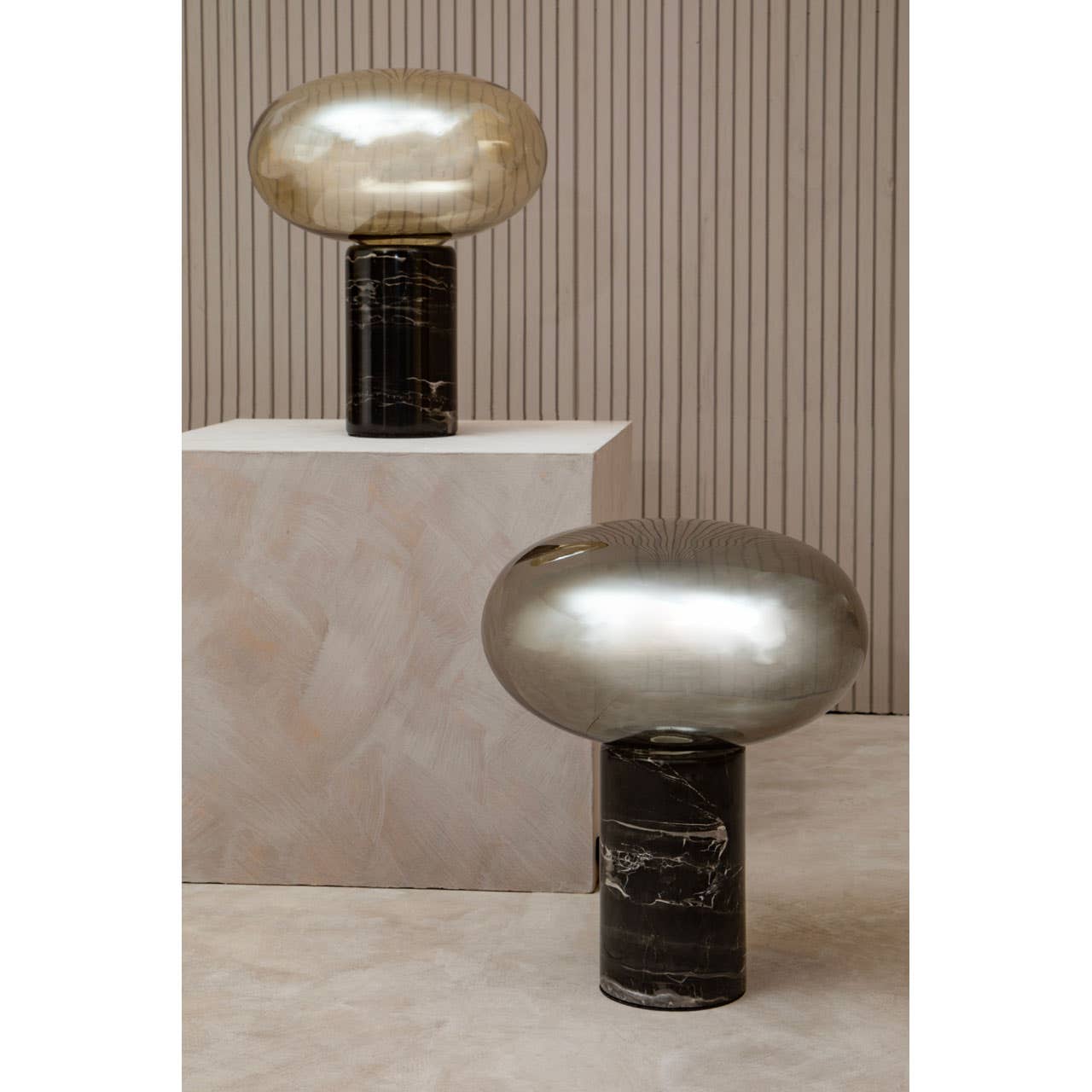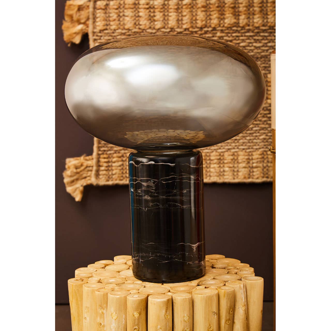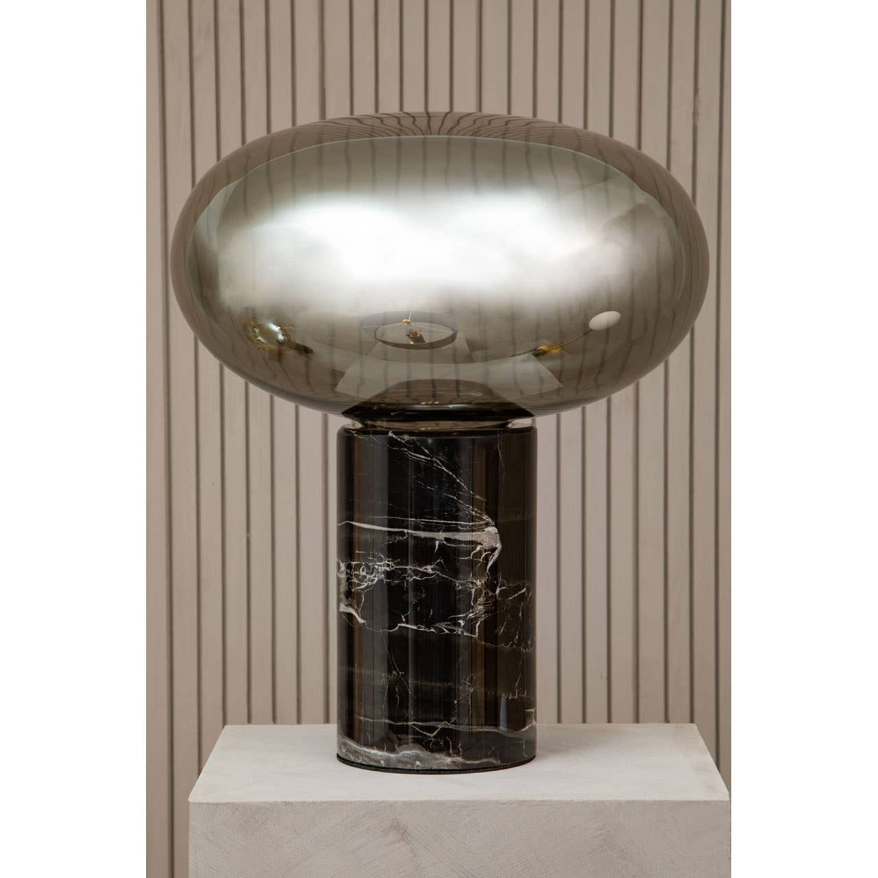 This table lamp showcases a geometric profile that will enhance the ambience of the living area. A black smoked glass round shade is fixed neatly on a cylindrical black marble base.