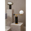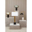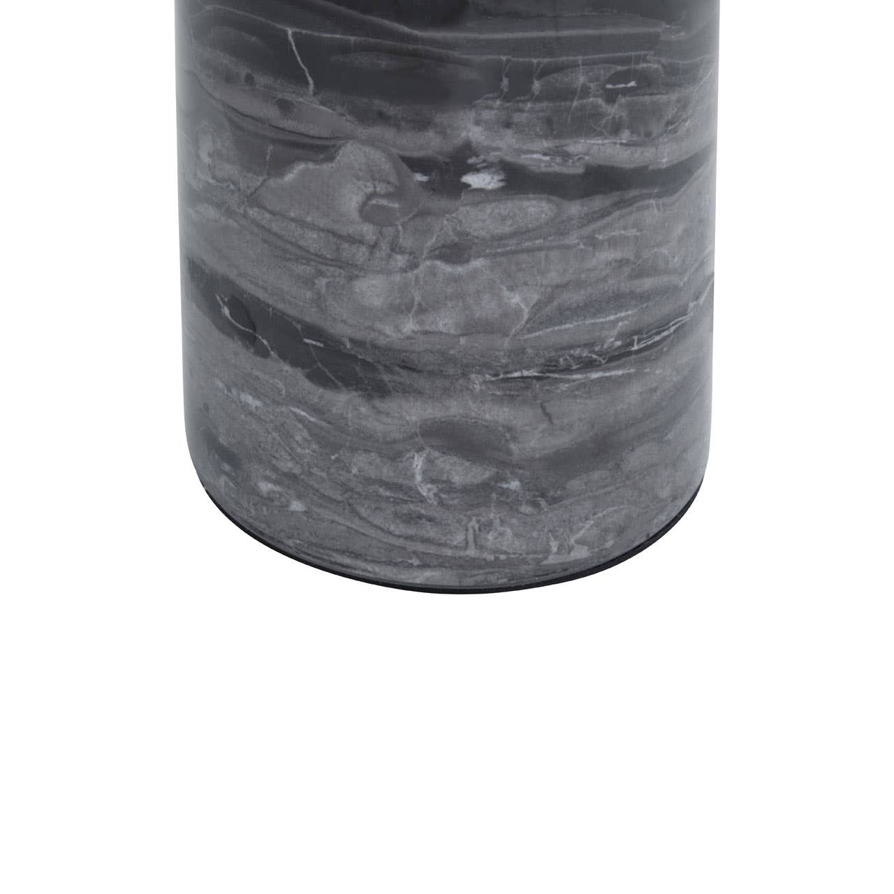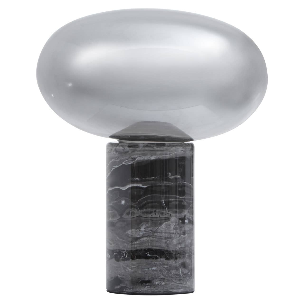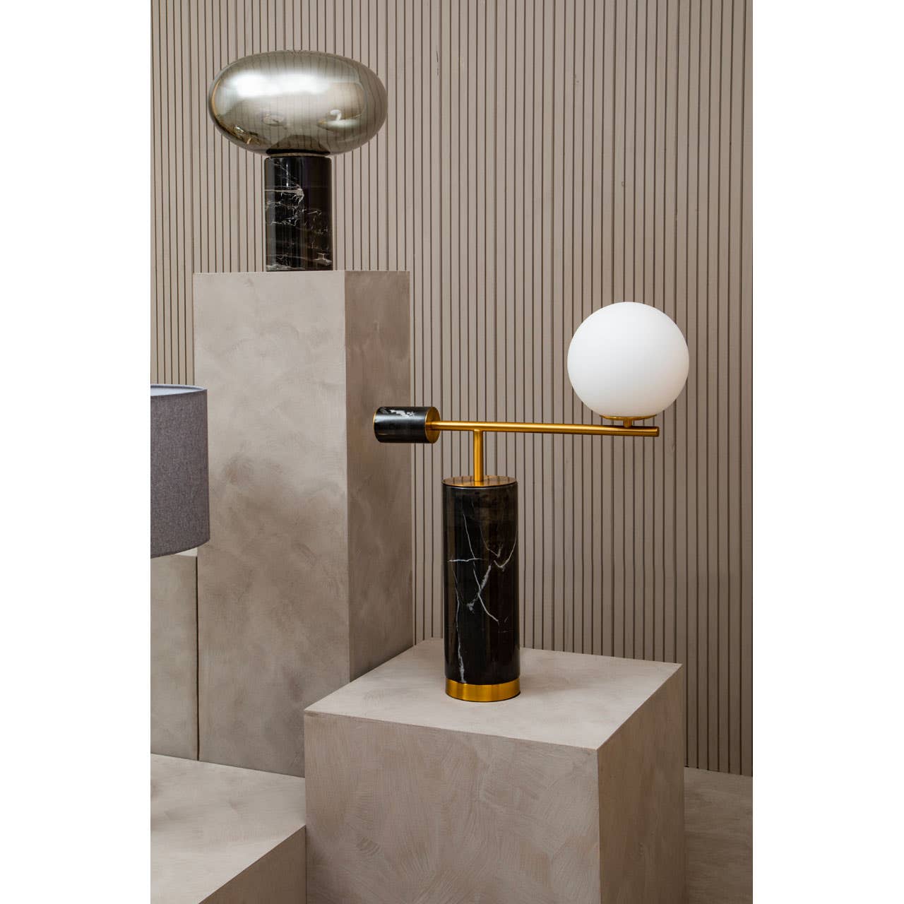 This table lamp showcases a geometric profile that will enhance the ambience of the living area. A black smoked glass round shade is fixed neatly on a cylindrical black marble base.