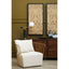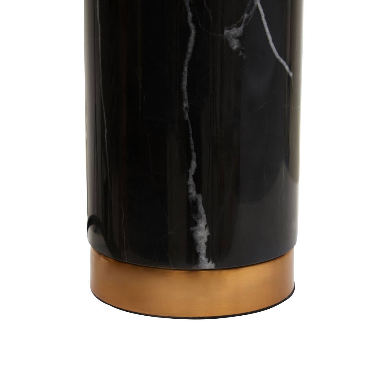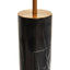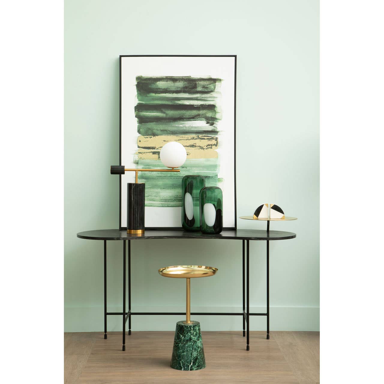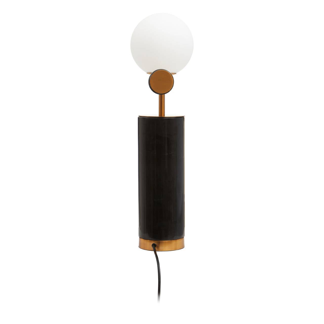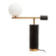 The Marmo table lamp exhibits pure geometry with its clean line structure and sleek profile. The white glass globe-shaped shade is expertly attached to the adjustable stem that sits atop a cylindrical black marble base.
