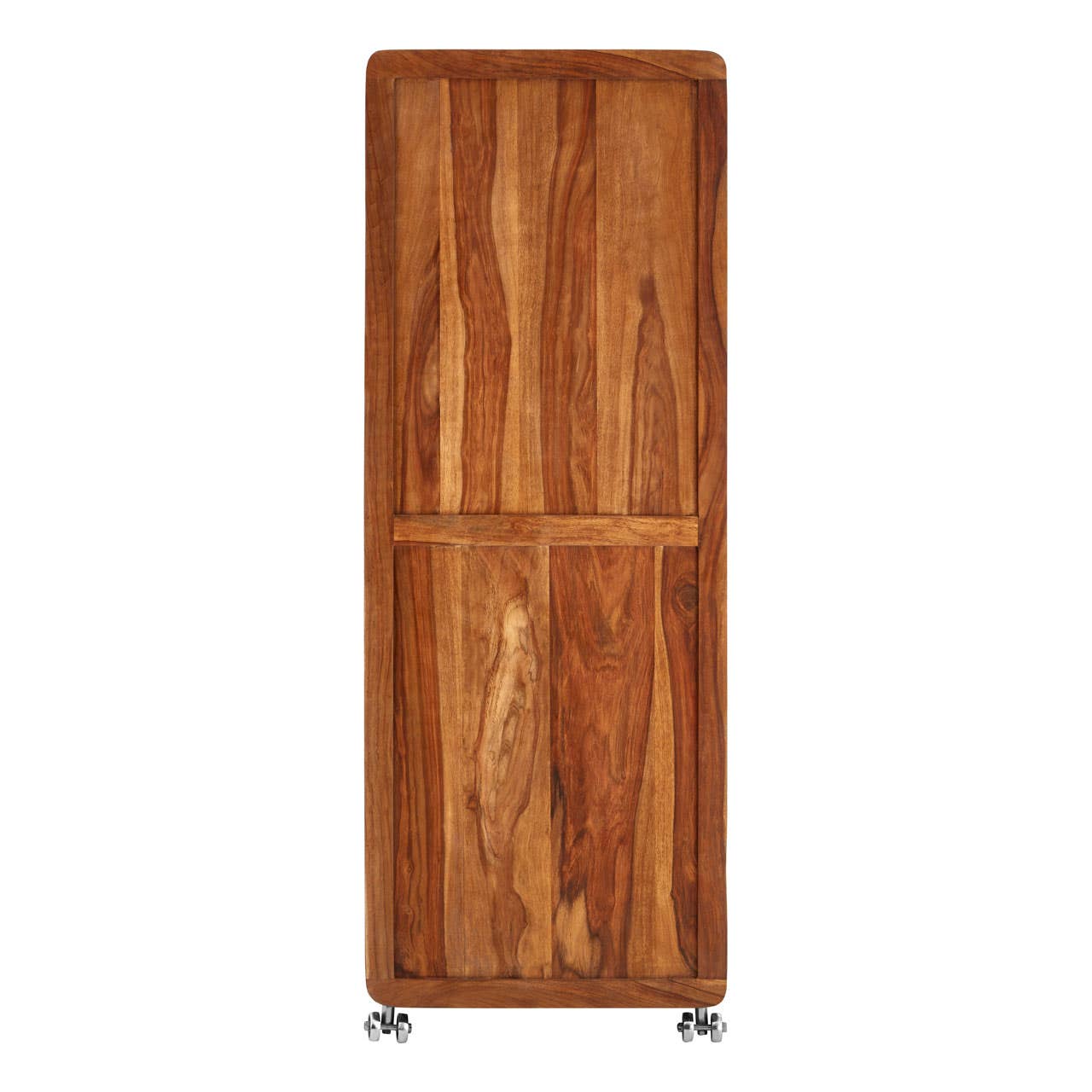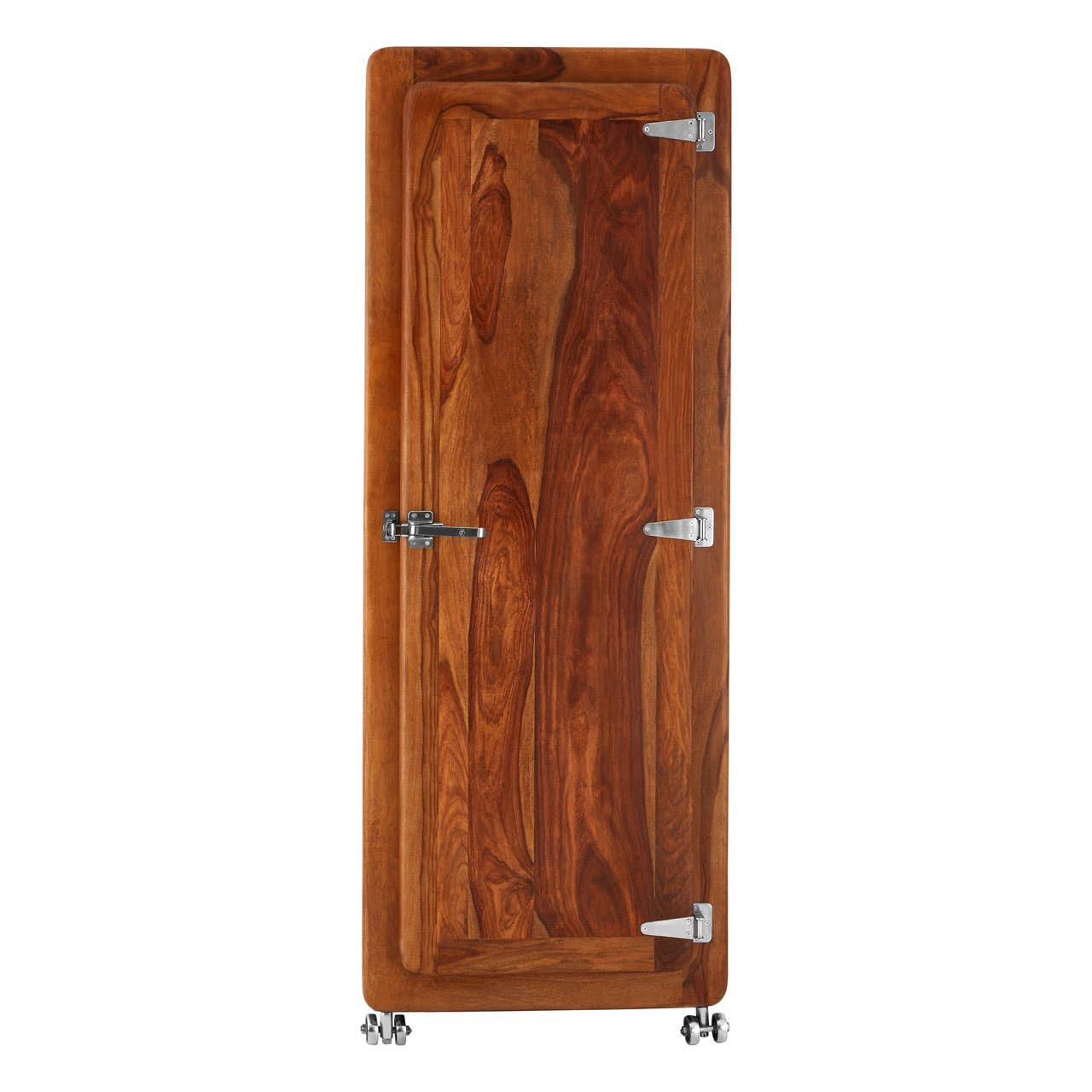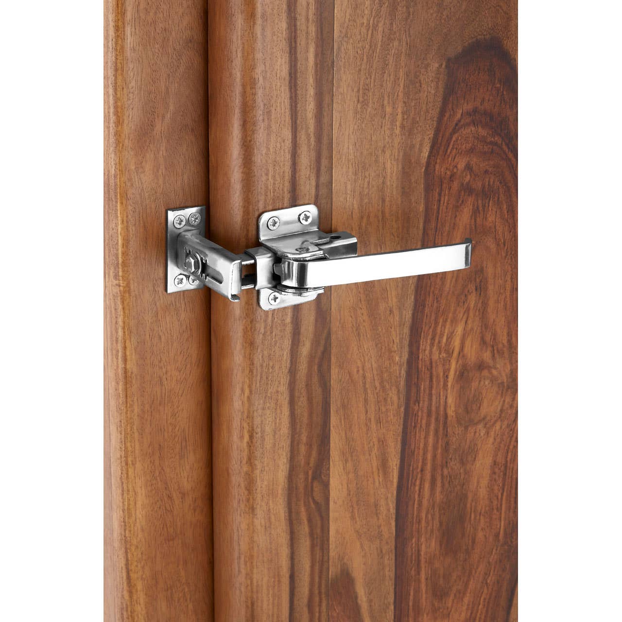Lending a soft industrial edge to the cabinet are metal hinges and a handle with a sleek chrome finish counterpointing the prominent natural graining of the wood.