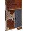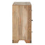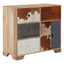 Each of the sideboard's four drawers and two cupboard doors boasts a different finish, from genuine brown and white cowhide to detailed carved patterns with a range of natural tone finishes. A variety of different handles and knobs enhance the sideboard's eclectic aesthetic and lend metallic counterpoints to the natural wood.