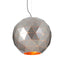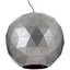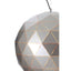 The shade is composed of a series of triangular forms made from tough steel. Slivers of space separate each segment, and when lit this allows small shards of light to escape. The cool silver finish and exquisite gold interior make it easy to coordinate with metallic design themes. A simple black cord suspends the light from the ceiling.