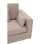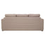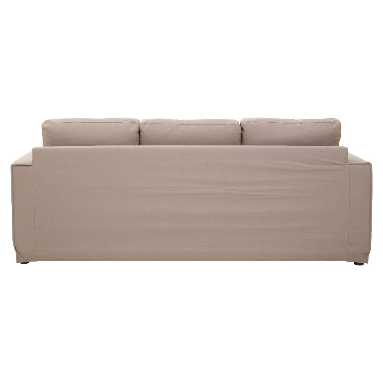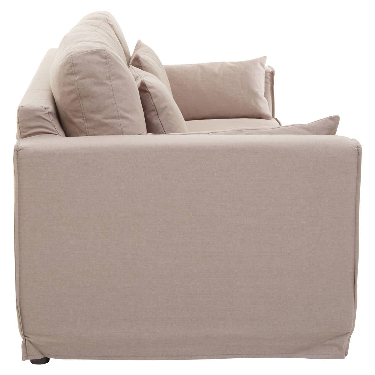 The three-seater sofa features muted-colour linen upholstery with a padded seat and matching cushions. The sofa is adorned with linear detailing on the lower front which adds to its luxe aesthetic.