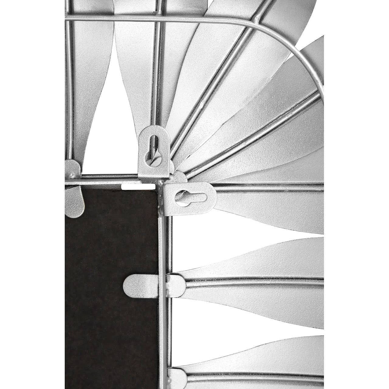The Merlin wall mirror's reflective surface is surrounded by a frame made from slim iron. Its angular design is counterpointed by the series of iron leaves, each one boasting a raised central midrib that accentuates its undulating form.