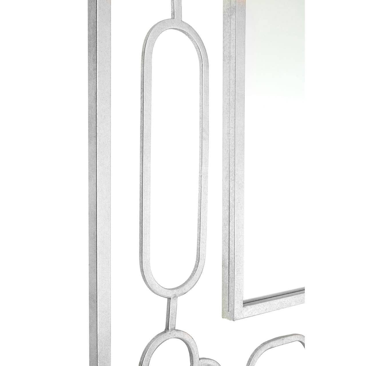 Its frame is formed from iron, with a silver finish that allows it to be styled with reflective metallic accessories and lighting. The rectangular mirror is framed by a slim strip of iron that corresponds with the larger outer border.