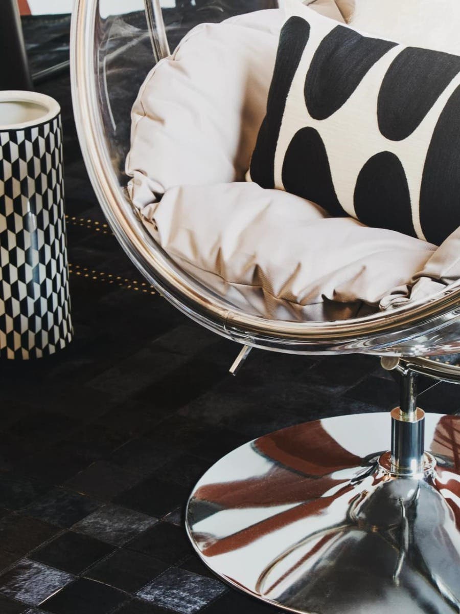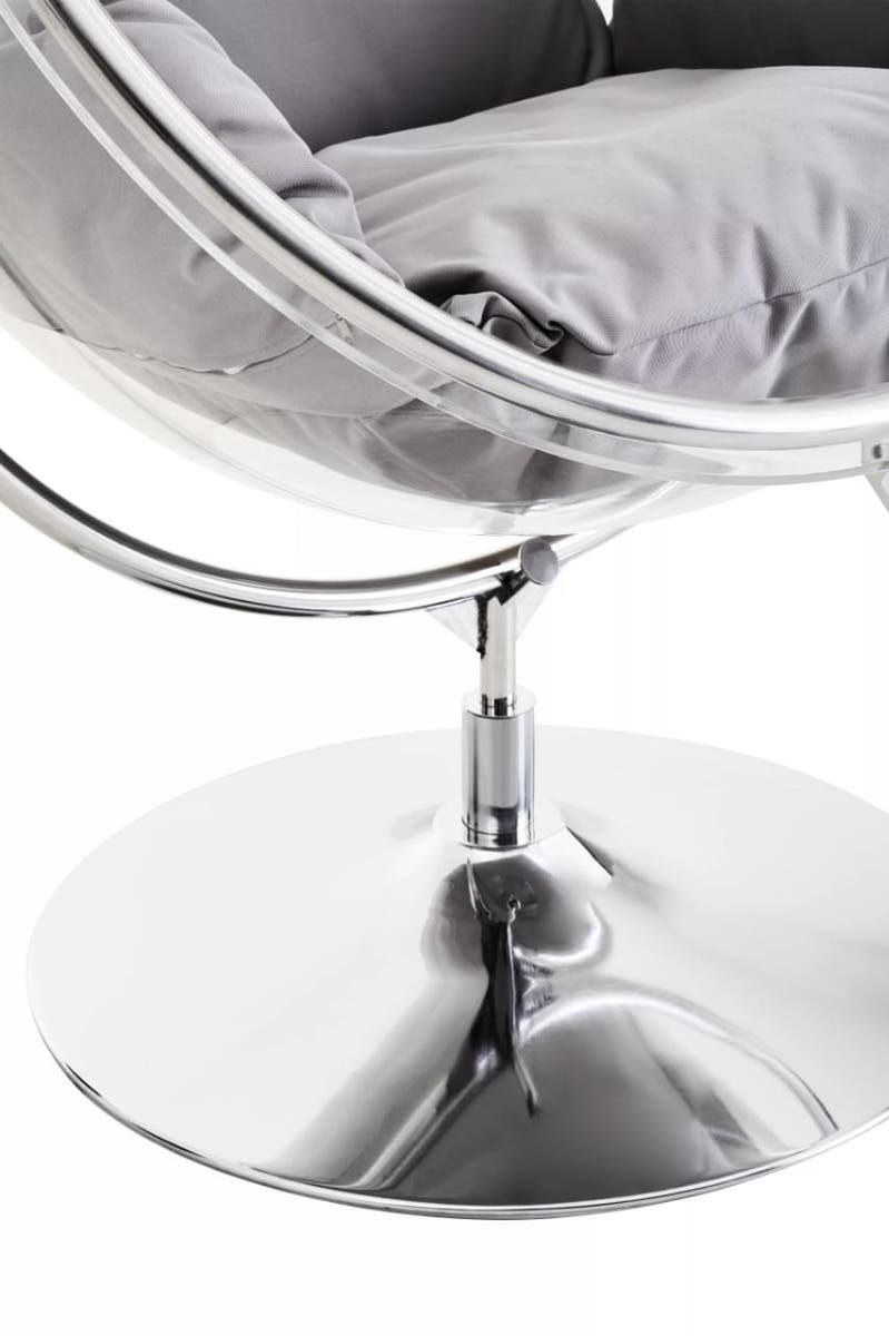 The stainless steel frame supports the clear seat of this hanging chair. The transparent seat has grey cushions in dense foam padding which add to the comfort, while the rounded base of the contemporary frame adds stability to the floating design.