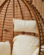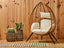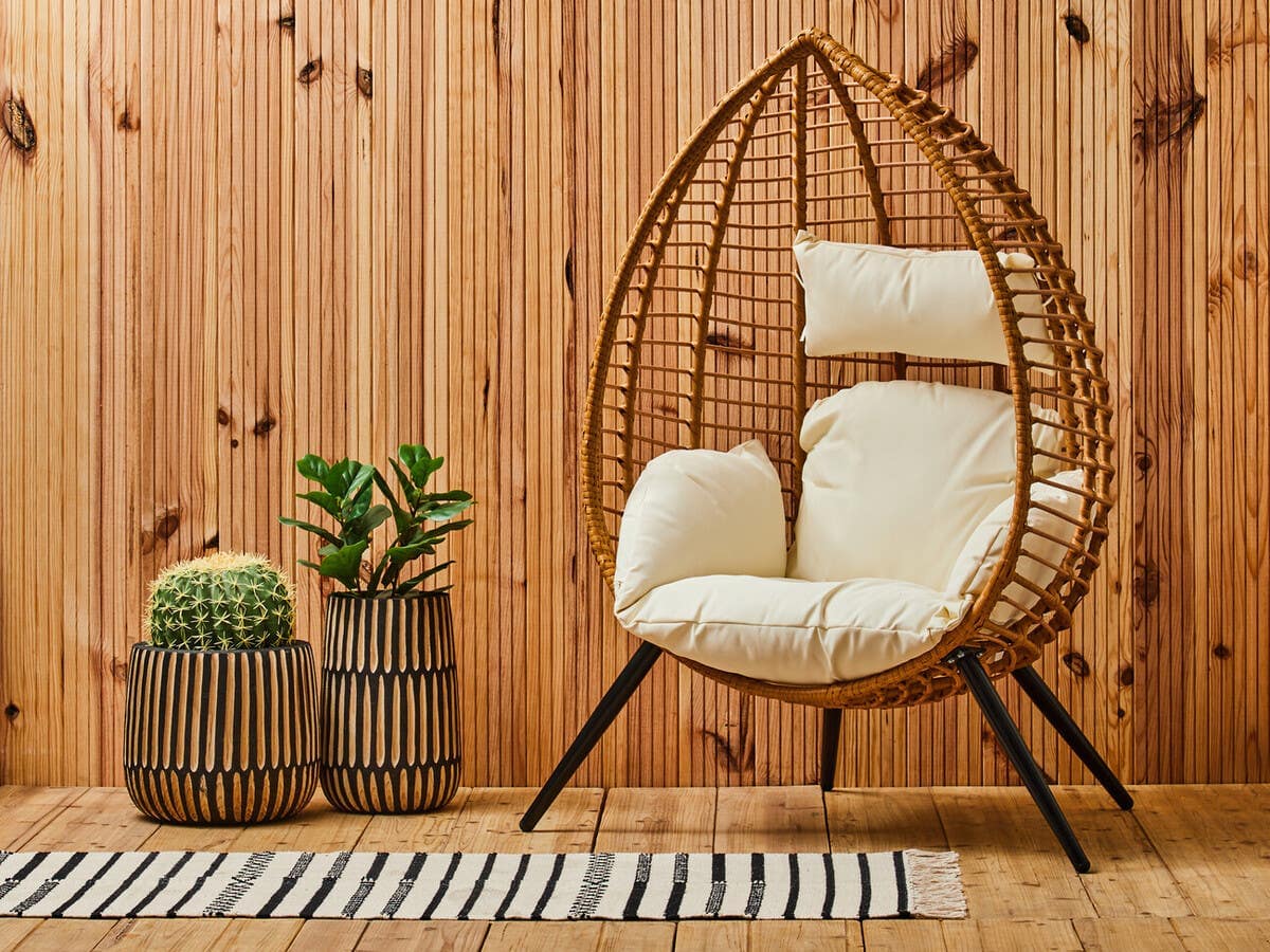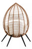 This chair has an egg shaped design that is crafted from a natural rattan effect. Cream cushions with foam filling add comfort while the sleek black metal legs provide stability and a modern look.