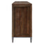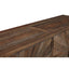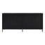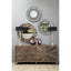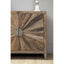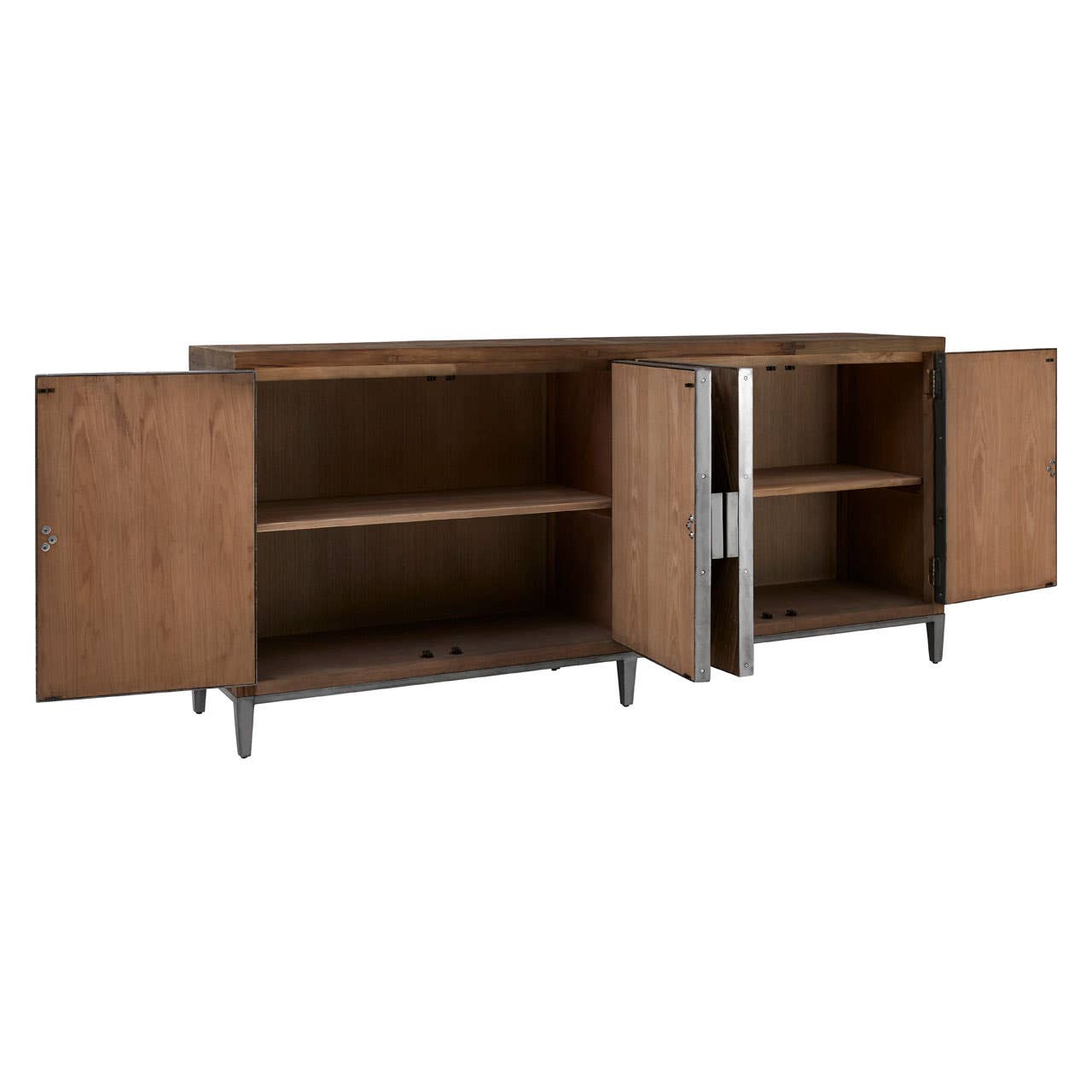 It features four doors at the front, inlaid with silver coloured steel to produce a metallic sunburst effect. Round silver iron handles and short silver iron feet coordinate with the lines.