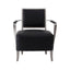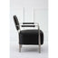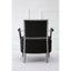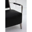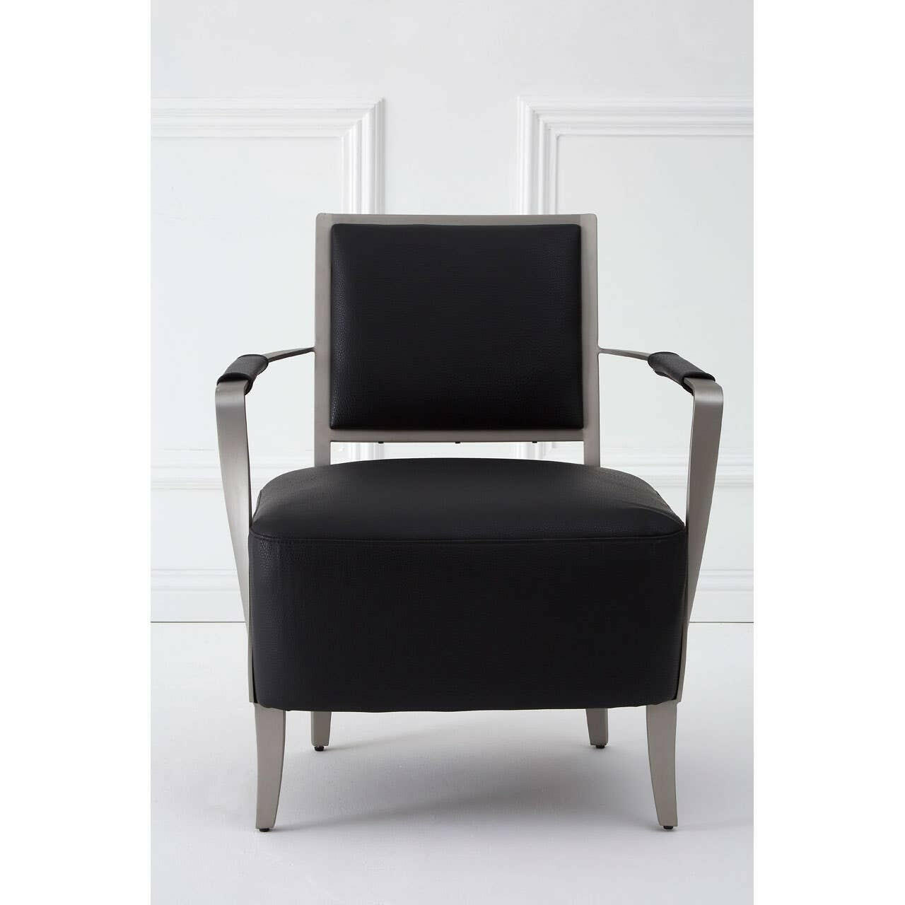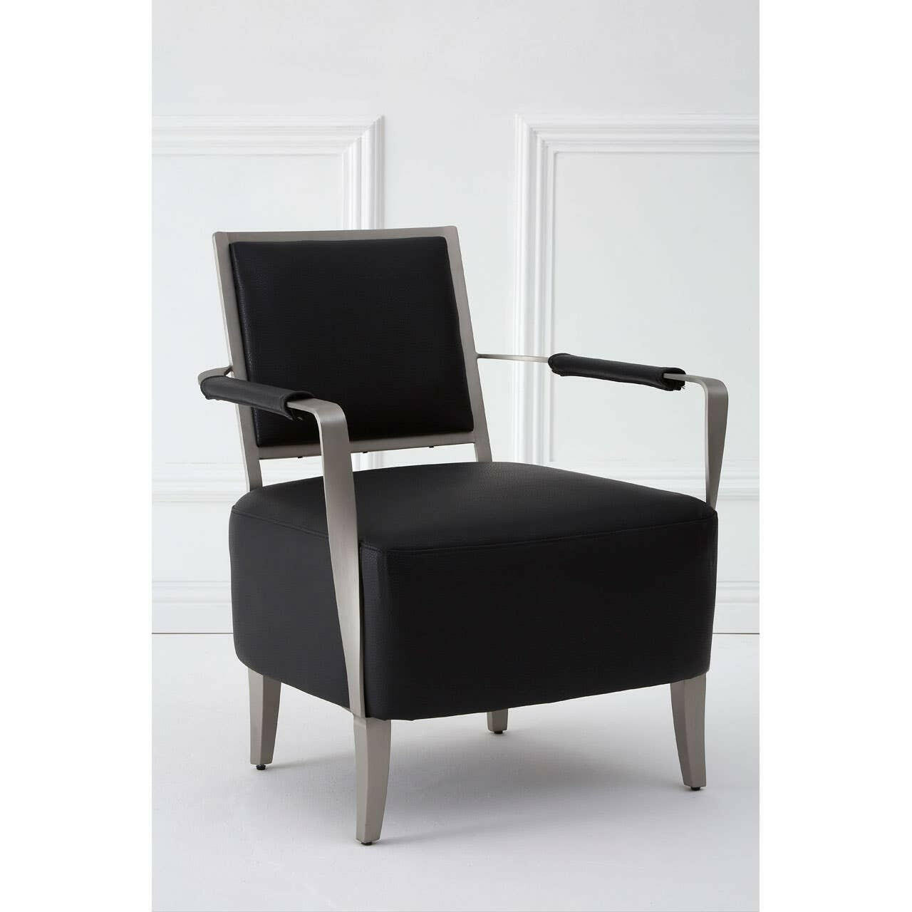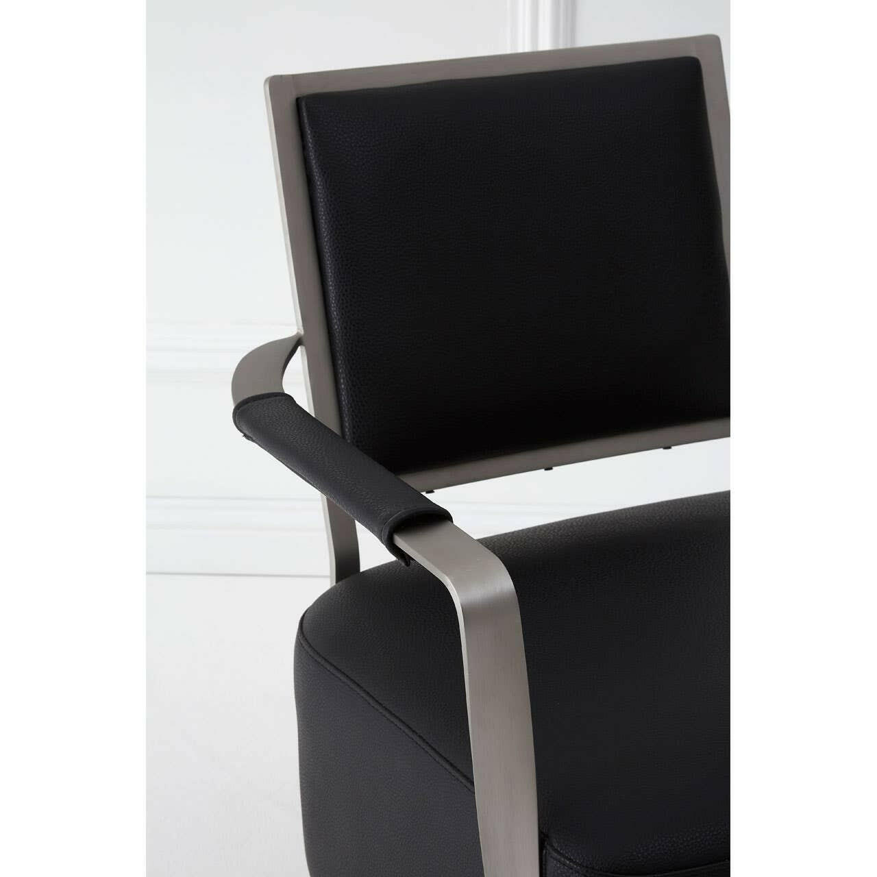Textured black leather is used to upholster the chair's expansive seating area, with coordinating leather finishes on its back and arms. The frame is made from tough stainless steel, with a brushed finish that gives the metal a muted satin look. Its arms travel outwards, before reducing into the front legs with a gentle twisting motion. Contrasting straight lines are used at the rear for the backrest.