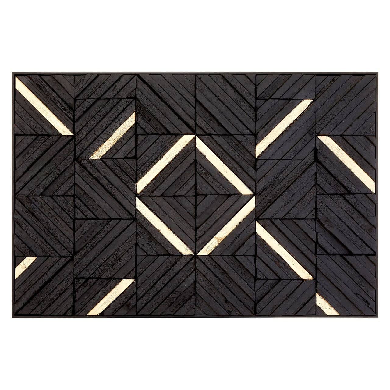 The intricate carvings form a geometric pattern on the wooden canvas. The black tiles with the occassional gold are assembled like a puzzle which stirs a sense of mystery. The abstract art enhances any contemporary space it is displayed in.