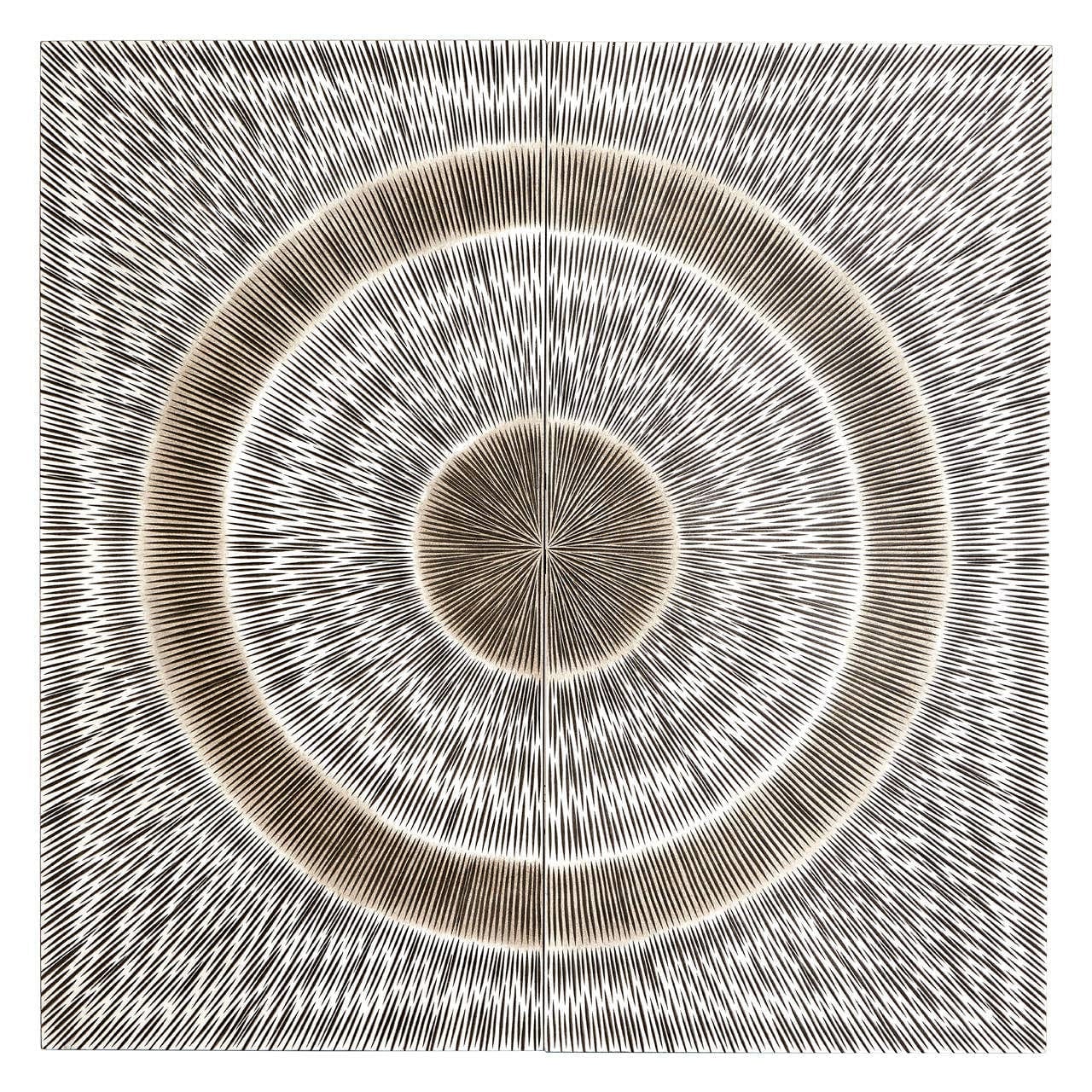 This entrancing wall art features a multitude of small linear scores carved in a circular pattern on wood. The antique silver finish enhances its uniqueness. This abstract art fits well in modern day living spaces or offices.