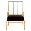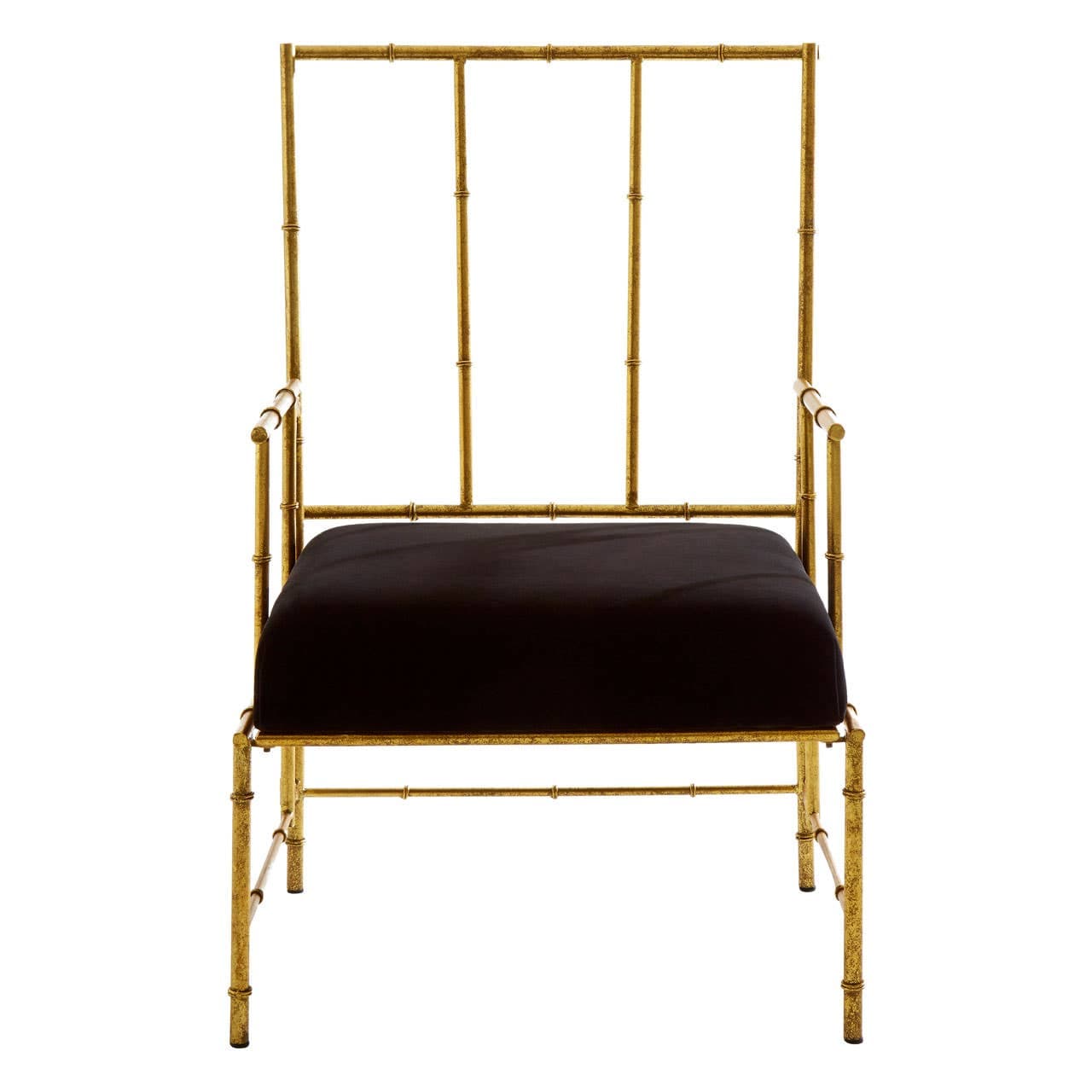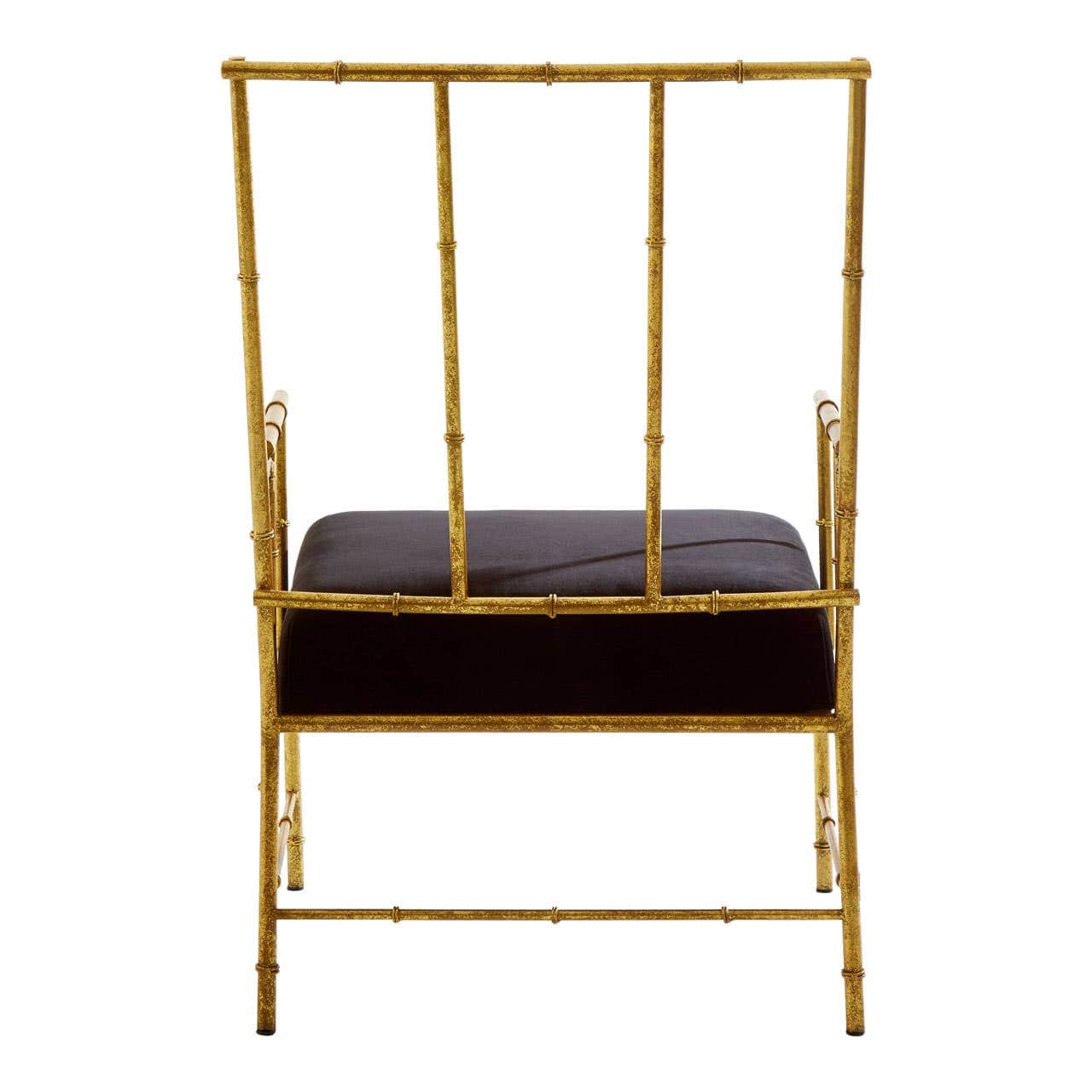 Its frame is crafted from iron and has a notched design that evokes bamboo rods. These are the only embellishments on an otherwise strikingly simple design. The gold finish is distressed to give the iron a textured look. A large and plump cushioned seat is dressed in tactile velvet. Coordinate with warm metallic accessories and lighting.