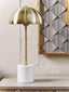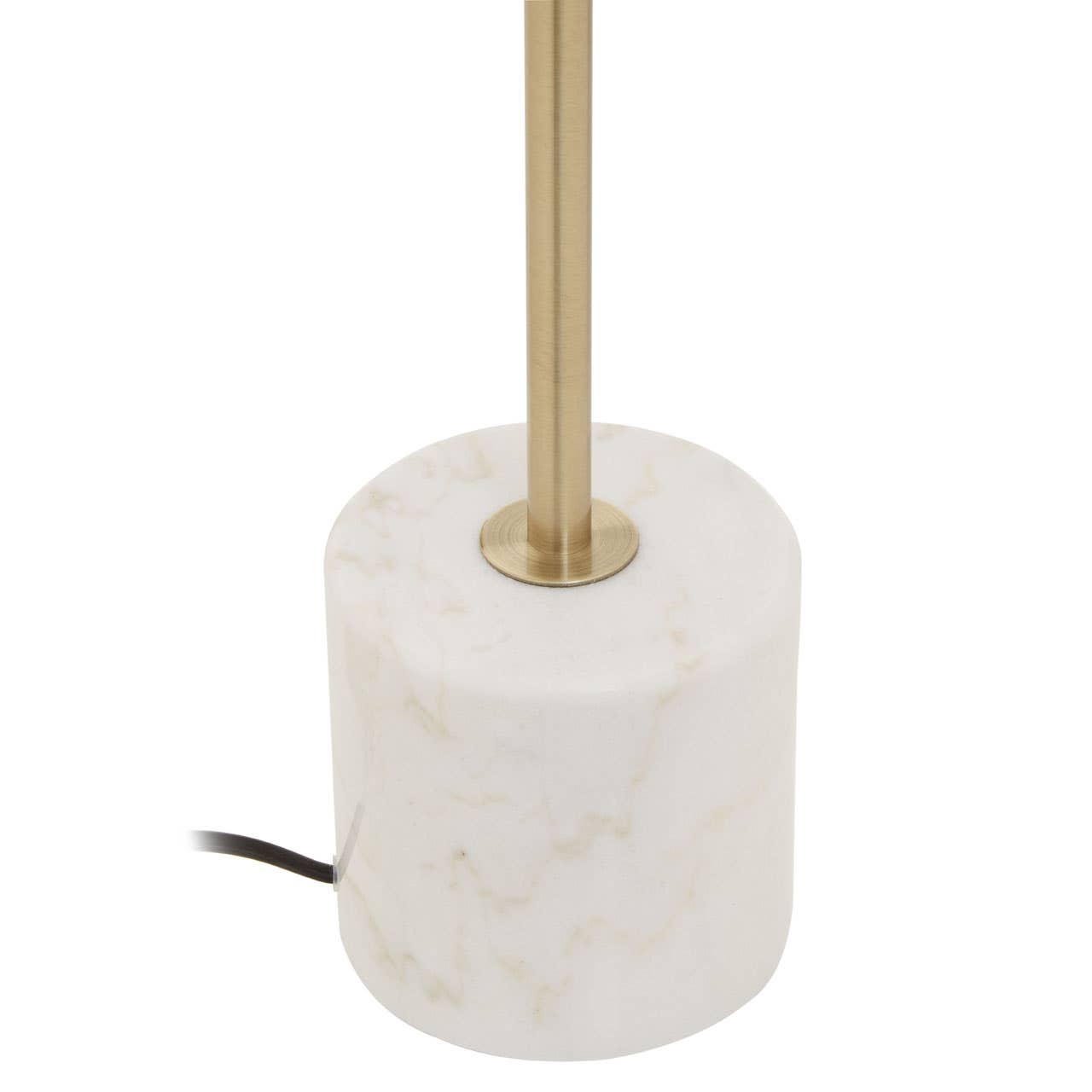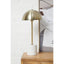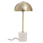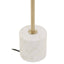 This floor lamp has a sleek metal structure in a gold finish, featuring a slender stem that extends to support a dome shaped shade. A cylindrical white marble stone base adds stability and softens the overall visual aesthetic.