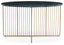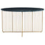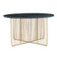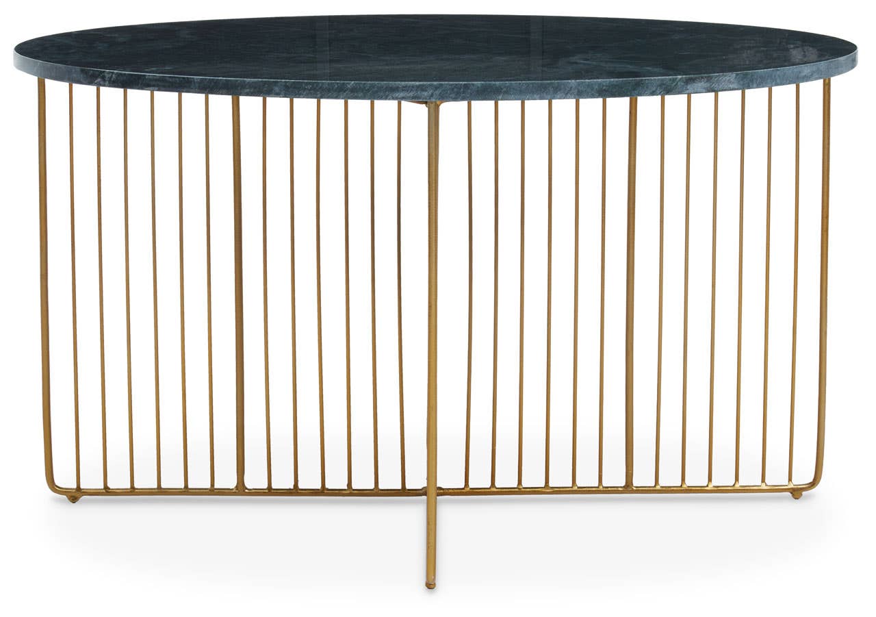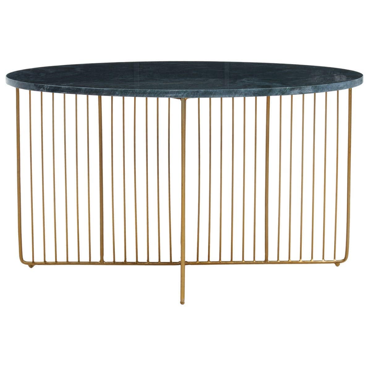The Nirvana coffee table is modern and sleek. The tabletop is green marble, perching on a gold contemporary base.