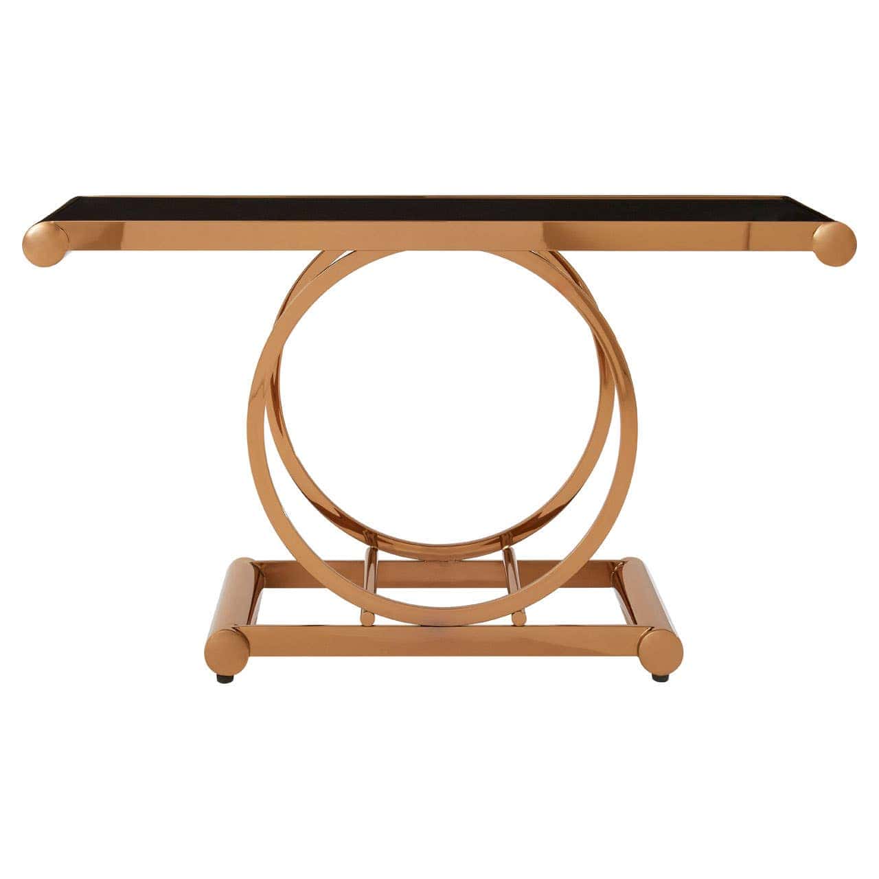 This luxurious console table is a contemporary combination of straight and rounded lines. Its rectangular top is made from black tempered glass which is set into a thick stainless steel frame. The top's round corners complement the circle that sits beneath. This large circle rests upon a base made from polished stainless steel.
