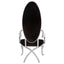 Upholstered in plush black velvet, this chair’s oval back is tufted with diamond pattern button detail. The curvaceous design and mirrored silver polish of the frame further its stylish, opulent aesthetic.