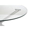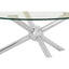 The low standing coffee table's distinctive base is created from durable stainless steel with a fashionable silver finish lending an elegant touch. The contemporary base features a metallic sphere in the centre, connecting the trio of angled legs with three angled support networks.