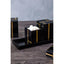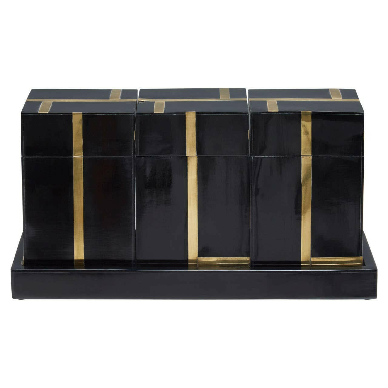 Featuring black resin outer, these coordinating canisters come in a smooth, reflective surface, while they are stacked in a rectangular tray. A linear inlay of brass finish filet adorns each canister with a decorative geometric aesthetic