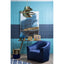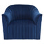 This stylish armchair is upholstered with lustrous deep blue velvet to give it a tactile finish that rewards the touch. Its exterior is left smooth to create a counterpoint to the vertical channel tufting that textures the seat and backrest. It features sweeping arms and a rounded backrest, with small black feet made from natural wood.