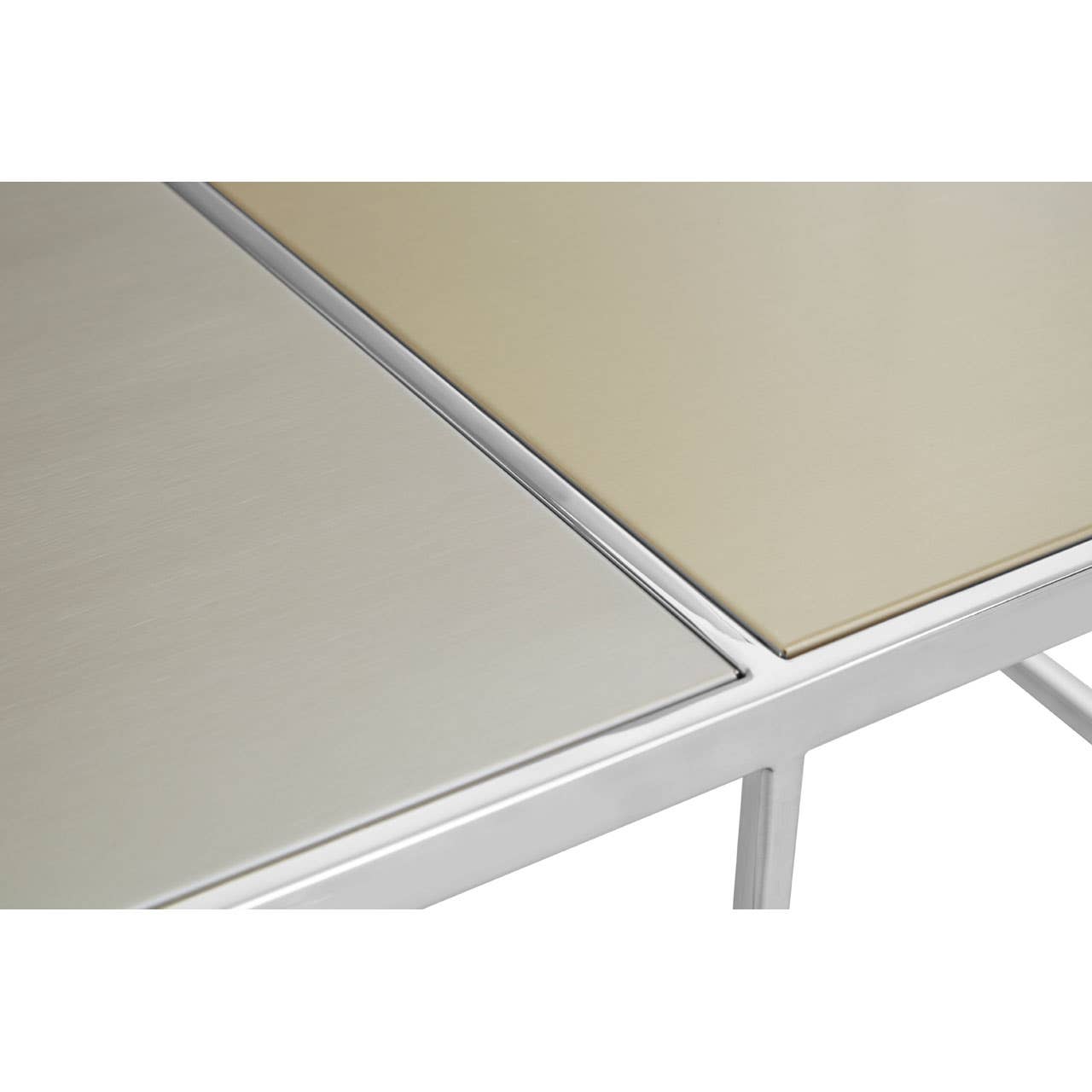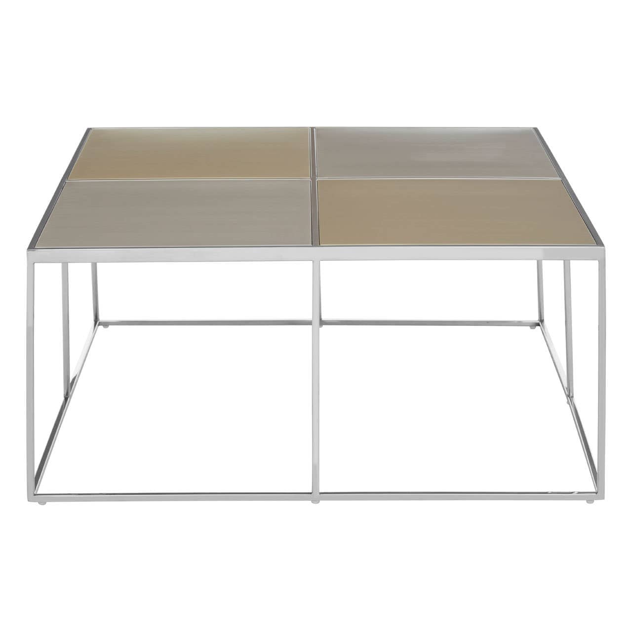 A checked brushed silver and warm gold checked design forms the top of this modern coffee table. Supported by a clean-lined silver square shaped base, the coffee table has a minimal design and is monochromatic in colour.