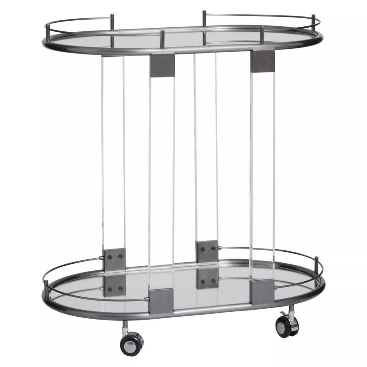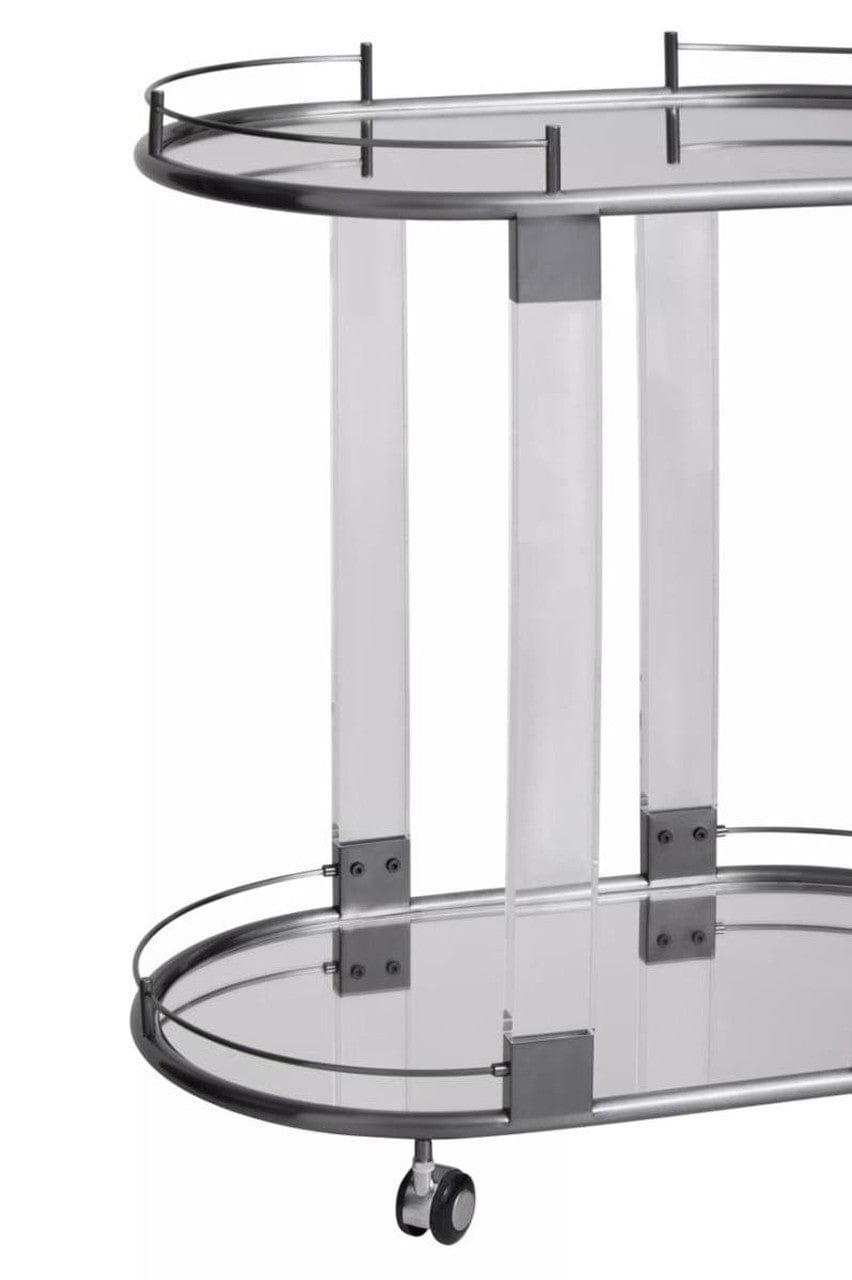 The Oria oval bar trolley has a stylish mid century modern design with two tiered white glass shelving and a sleek stainless steel and black acrylic frame. It's perfect for serving cocktails and has ample storage space.