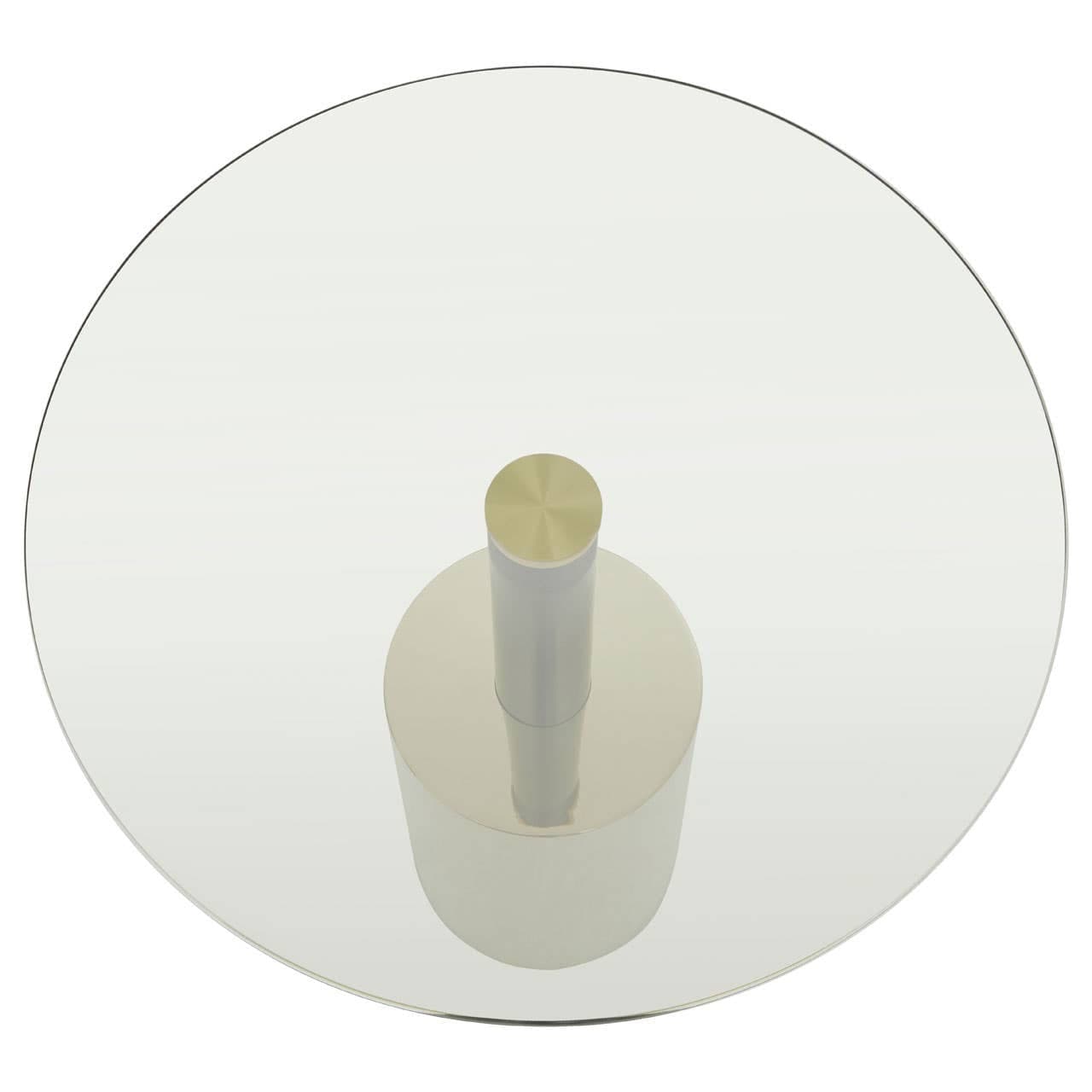 Contemporary in design, this end table has a round clear glass tabletop and coordinating gold stainless steel cylindrical, base, joined in a pedestal form by a black metal frame.