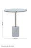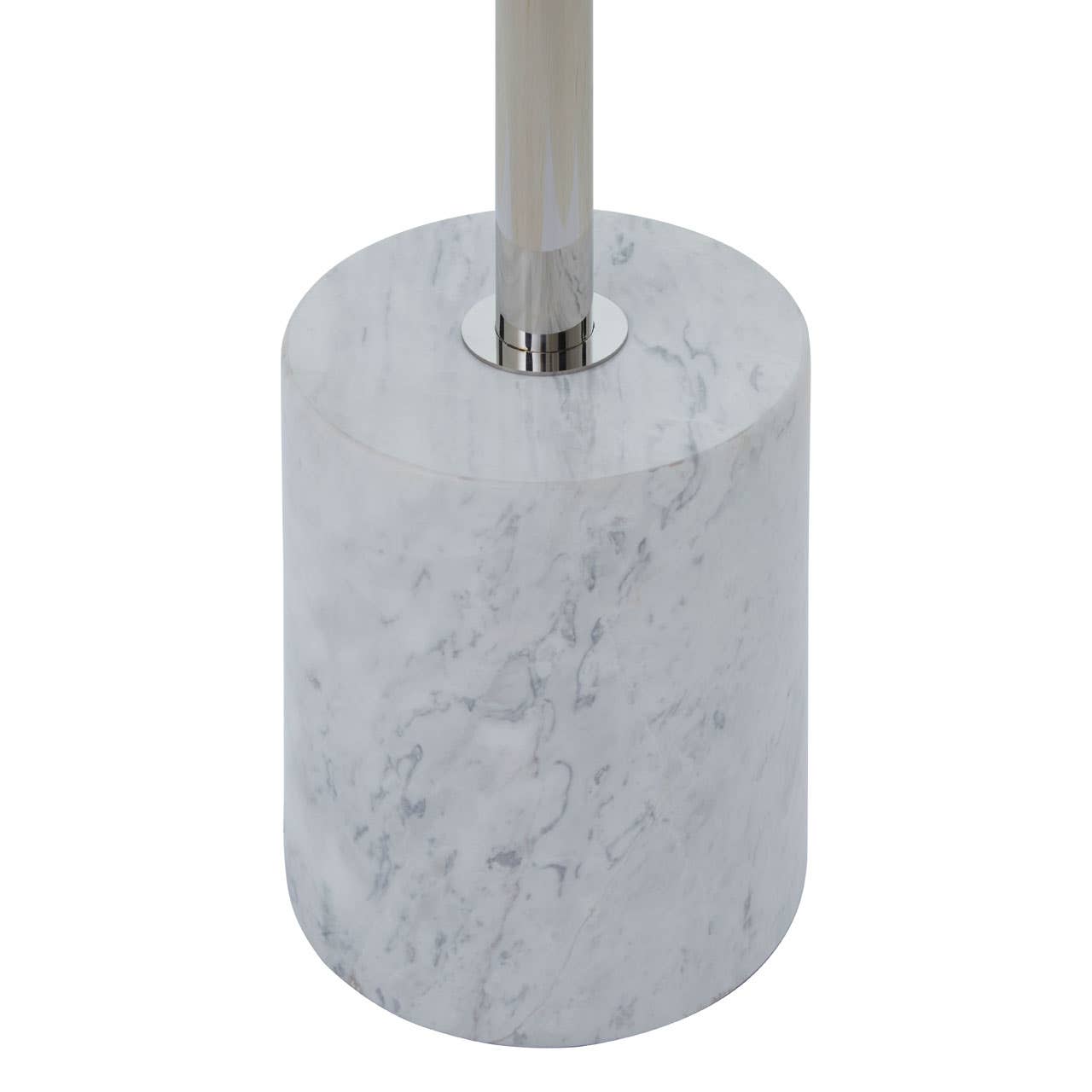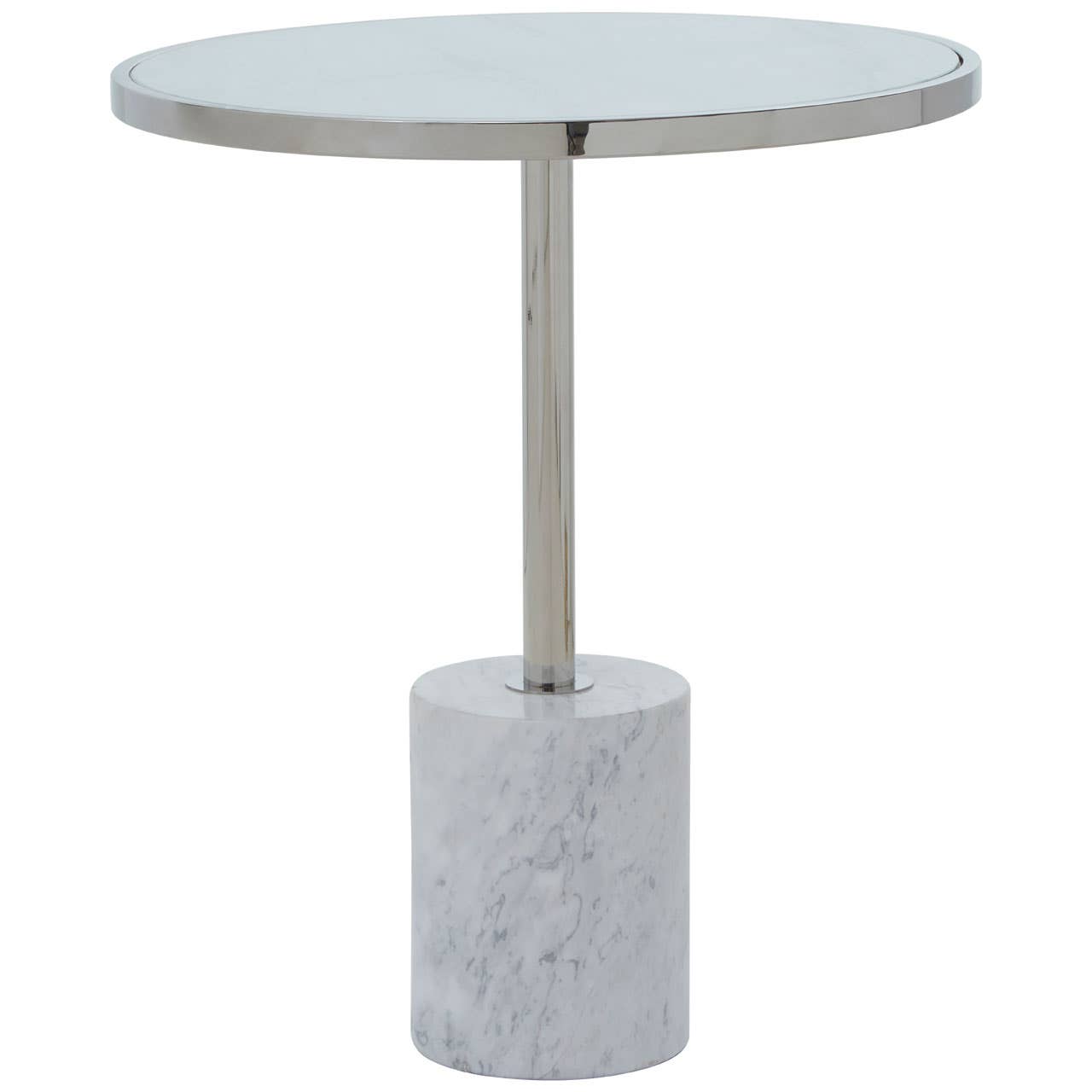 Contemporary in design, this end table has a round white marble tabletop and coordinating cylindrical, pedestal base, joined and encased in chrome finished stainless steel. The glamorous white marble and chrome finish create a luxe aesthetic.