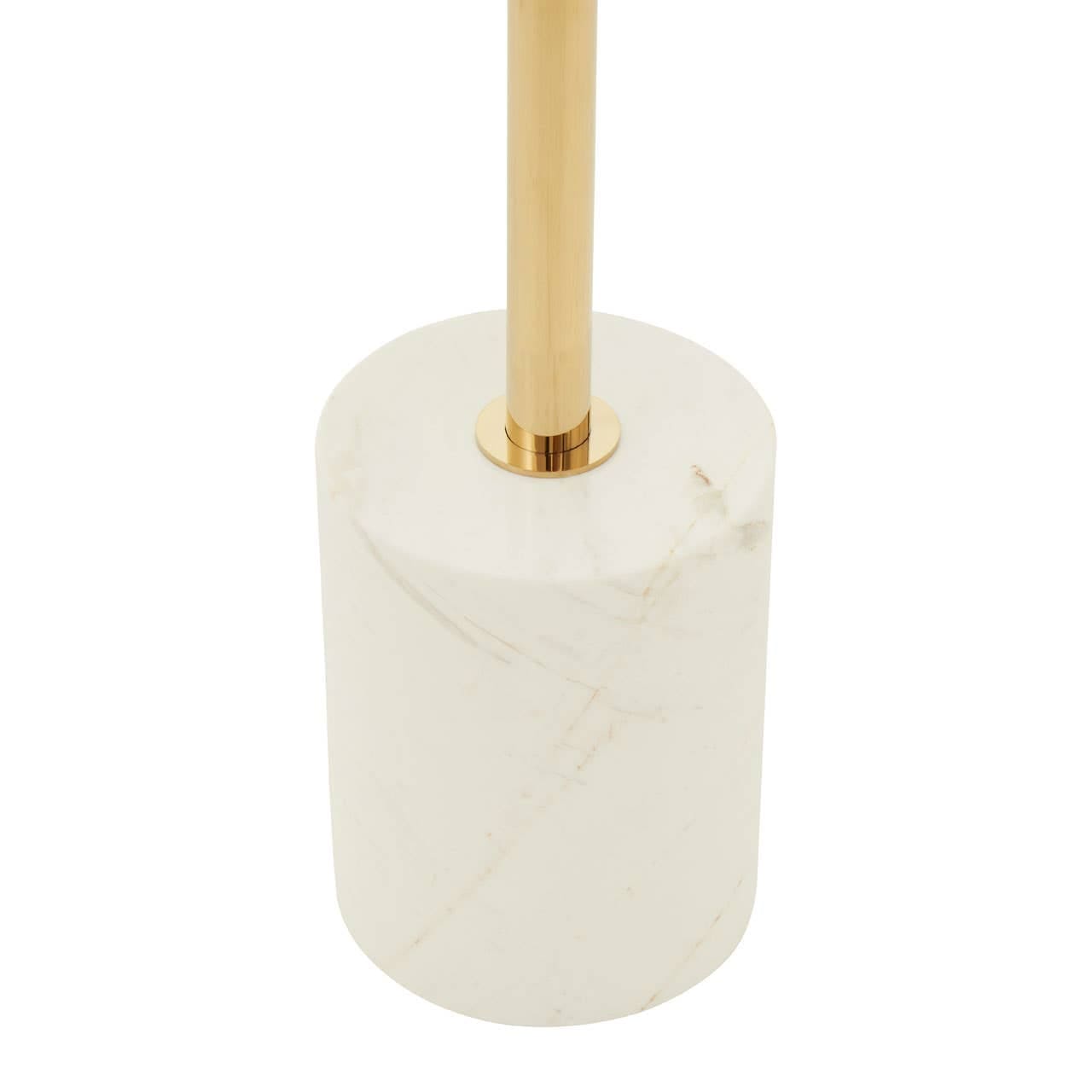 Contemporary in design, this end table has a round white marble tabletop and coordinating cylindrical, pedestal base, joined and encased in gold finished stainless steel.