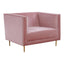 Upholstered in plush pink velvet, this armchair comes in thick padding featuring minimal channel detail. The warm metallic stainless steel base furthers the luxe accent and harmonises with vertical lines along with the seat and backrest.