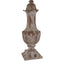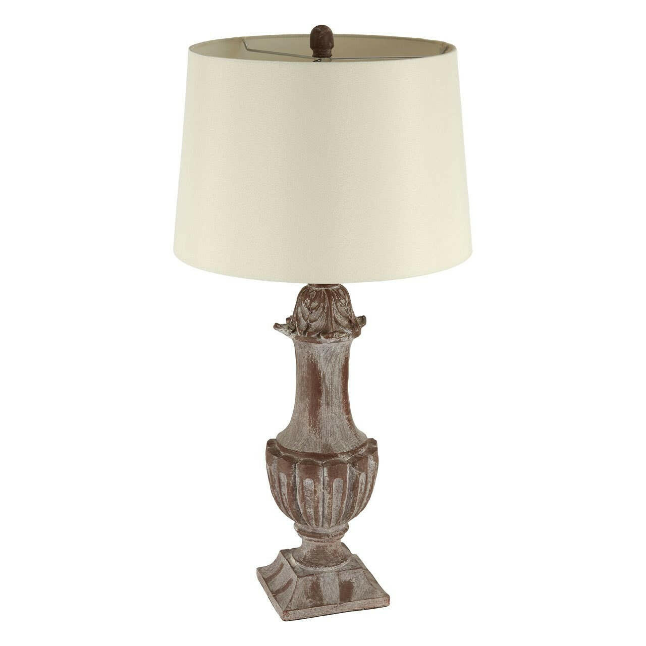 From its tapered foot to the rounded finial that emerges above the beige shade, this large table lamp exudes ornate elegance. Its carved base has a weathered finish that contributes to the lamp's antique style. The shade is made from soft linen, and has a beige colour that will diffuse light softly.