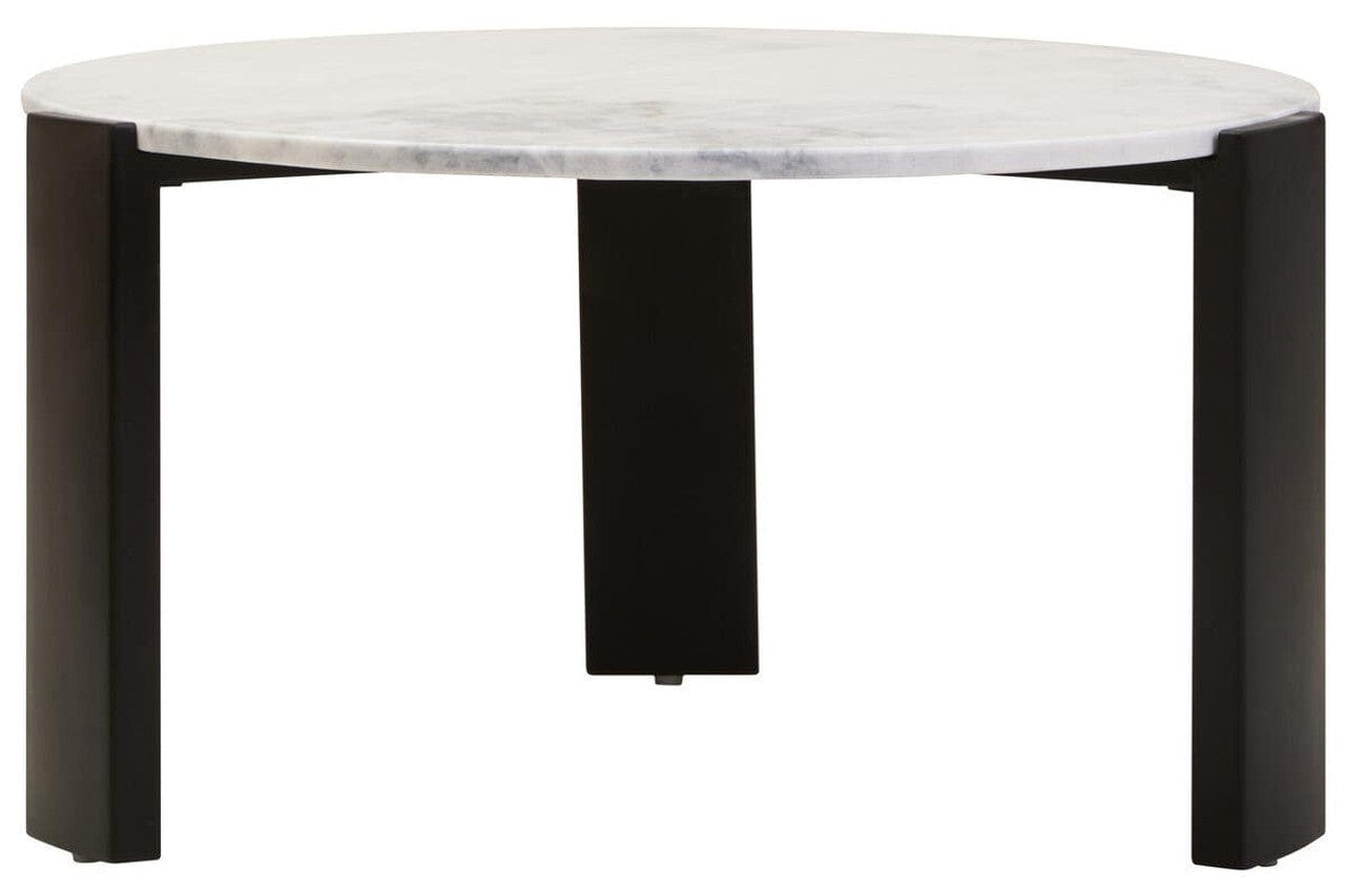 This round coffee table has a white marble top in a smooth finish, offering a touch of luxury to the living room. Crafted from black finish acacia wood, its sturdy legs create a striking and visually appealing design, making this monochromatic coffee table a perfect focal point for modern living rooms.