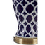 The Paloma table lamp is a curvaceous accent piece for the living room. Its smooth ceramic body has a white finish with blue quatrefoil-esque motifs that accentuate the lines of its urn shape. The body is mounted on a golden metal base which complements the finial that emerges from the top of the soft linen shade.