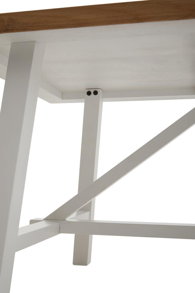 The dining table features an oak wood top in a smooth reclaimed natural finish and a birch wood base in a white finish. This table also features a sculpted sturdy structure with curved supports and gives off a farmhouse touch and durability.
