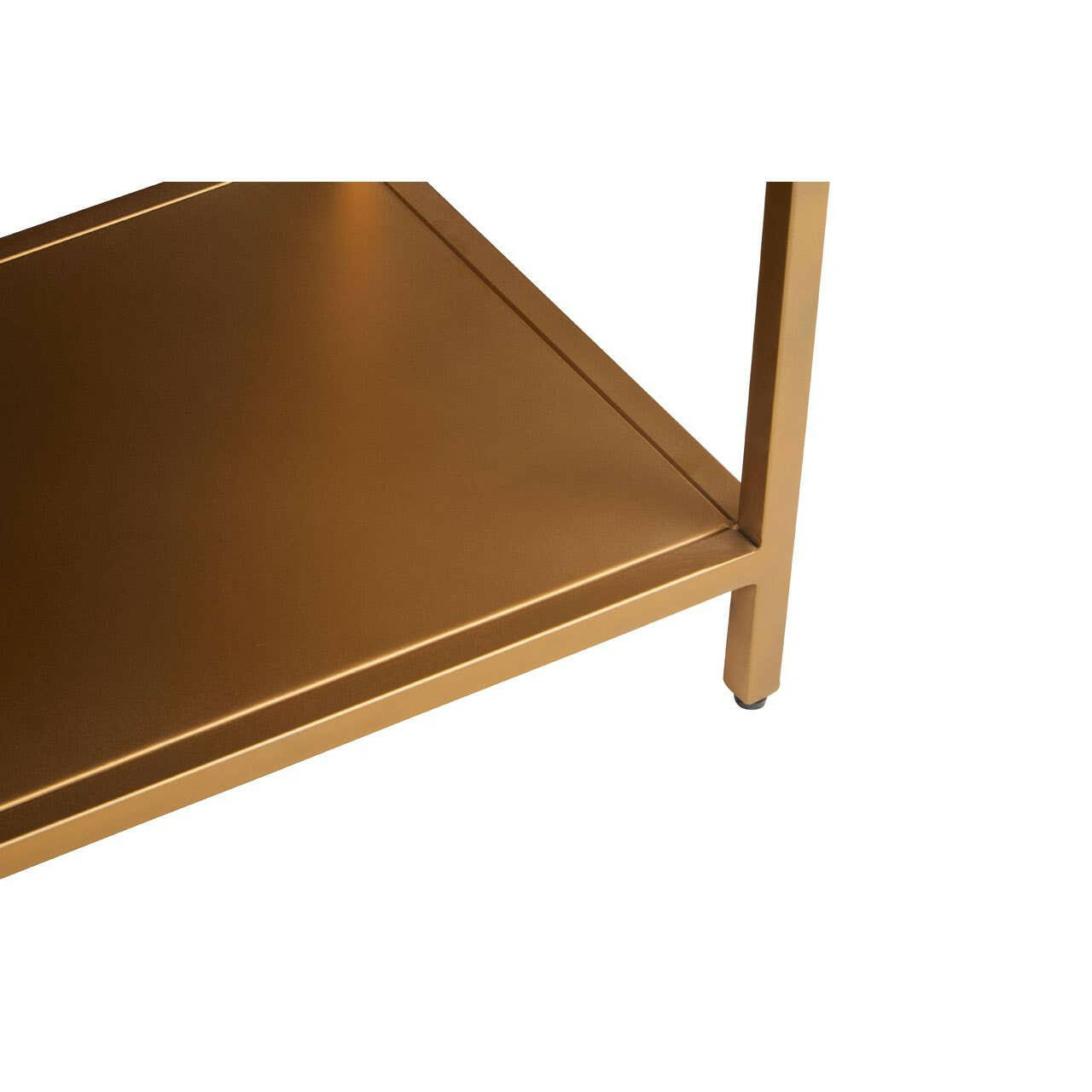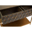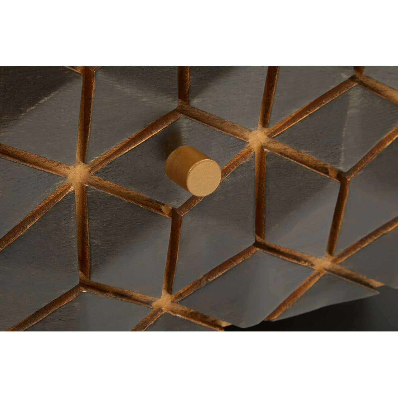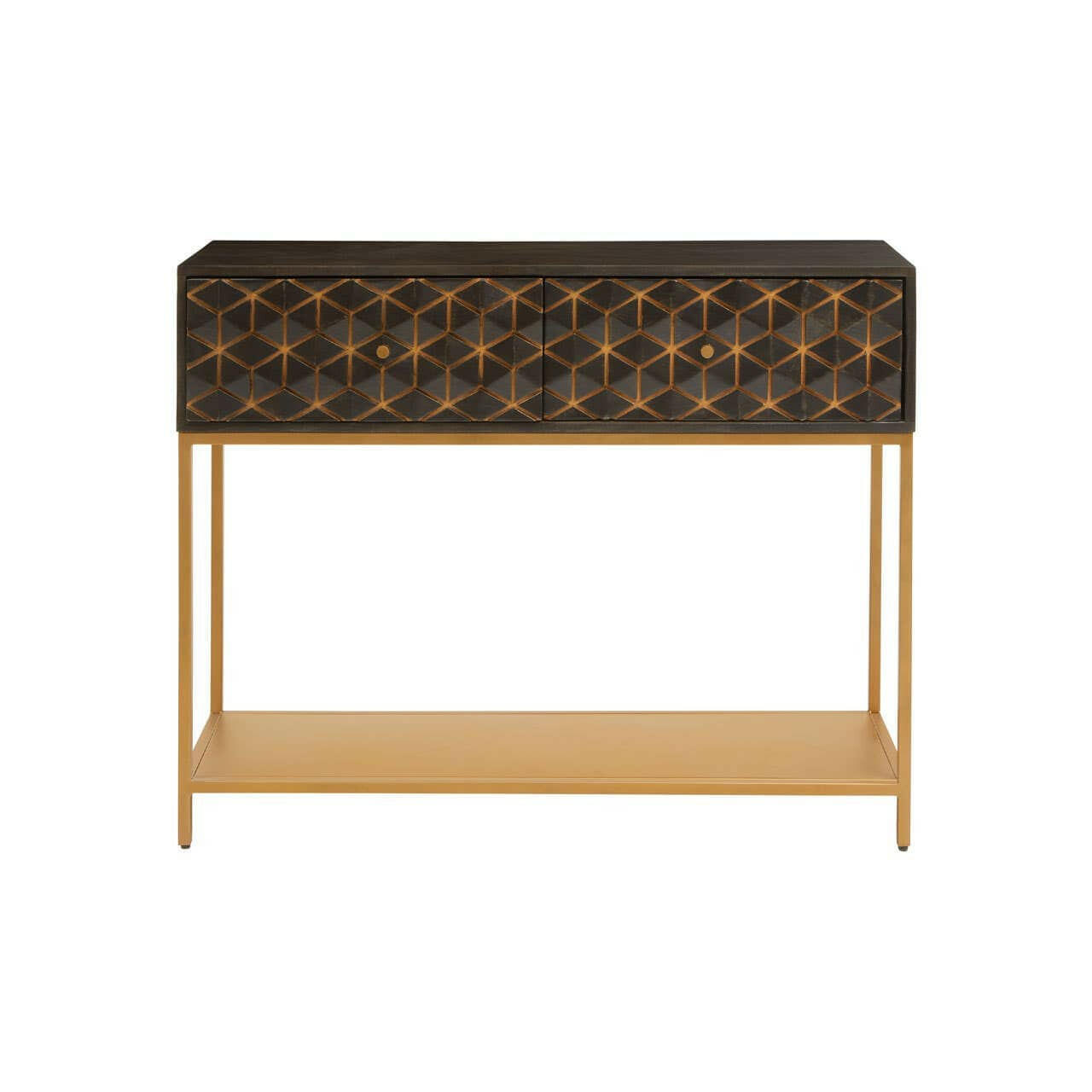 The Patna console table is contemporary and sleek, grey mango wood is adorned by hexagonal gold iron detailing over the table, balanced by a chic lower gold open shelf, creating storage solutions and a statement piece.