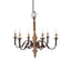 The curved outline of the wooden body on the Paulette chandelier reaches outwards via the six metal arms, with each arm supporting a single candle at the end. The antique replica surface of the metal give this light a distressed look, while the decorative detail on each arm contributes to the elaborate style. The chandelier is suspended from the ceiling by a metal chain, while each candle is given a melted wax detail. Chandeliers perform well as a centrepiece, while their ability to disperse a wide pool of light makes them perfect for dining areas, hallways, and living areas.