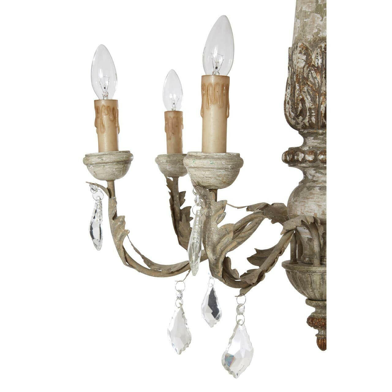 The wood surface of the rococo-inspired Pavatti chandelier is given a distressed look, which is contrasted by the gold effect that traces the decorative areas. The rustic style is maintained by the six metal arms, each with decorative leaves, that stretch out to support the electric candles. The melted wax effect on each electric candle adds authenticity, while the glass droplets that hang from the arms provide some sparkle. The Pavatti chandelier would create a grand impression in a hallway or dining room.