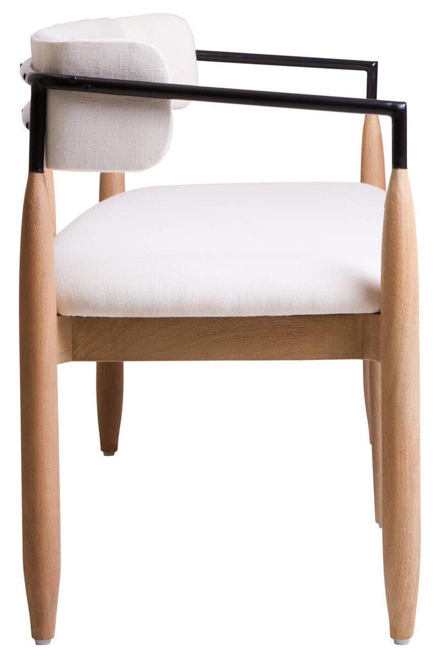 This dining bench is a fusion of black finish iron top and natural mango wood base. This contemporary bench features a comfortable backrest and seat upholstered in cream finish texture fabric, making it a modish choice for contemporary dining spaces.