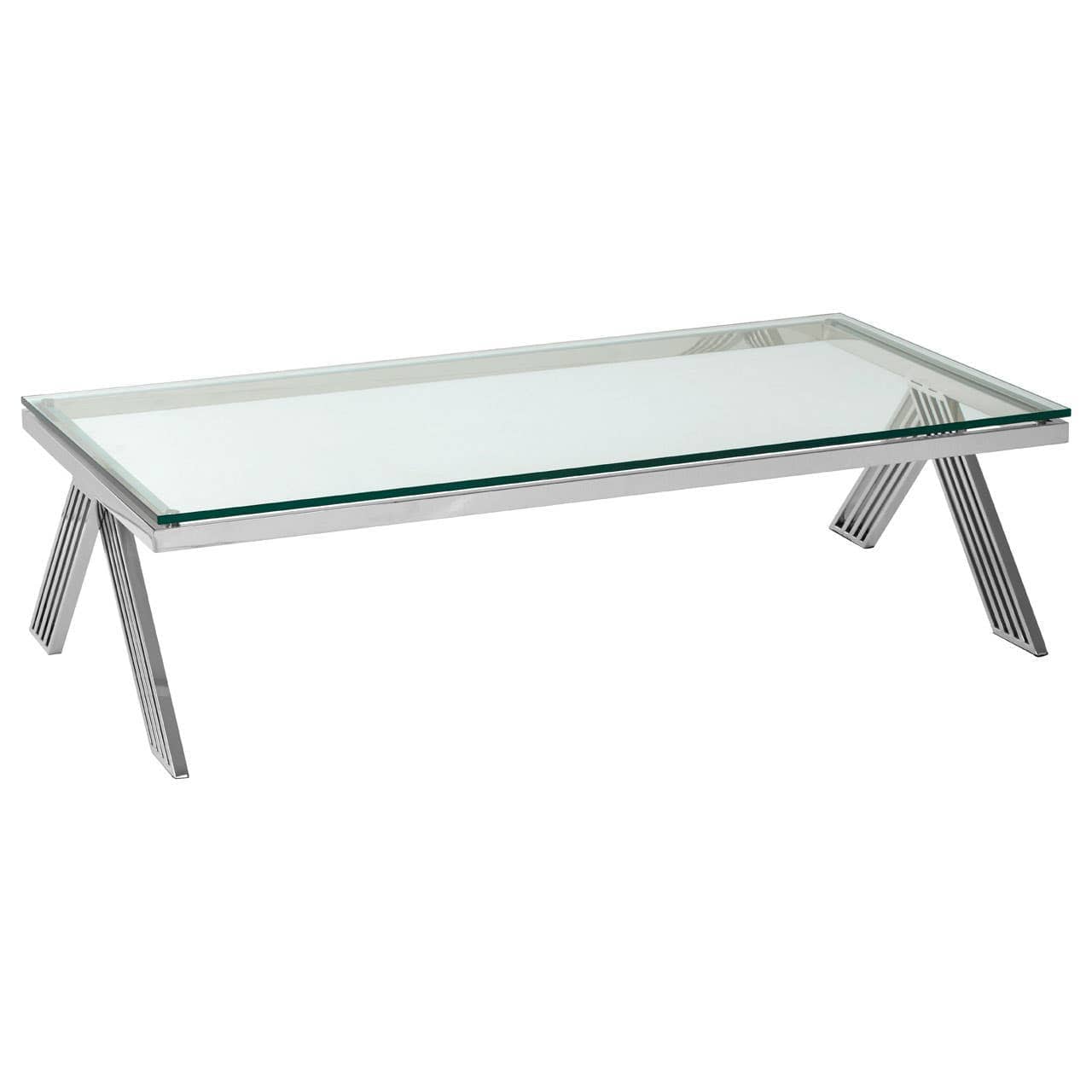 This rectangular coffee table is suited to luxe-style interior settings. Its angled legs are crafted from smooth stainless steel and have a reflective silver finish the clear glass top complements this sleek table