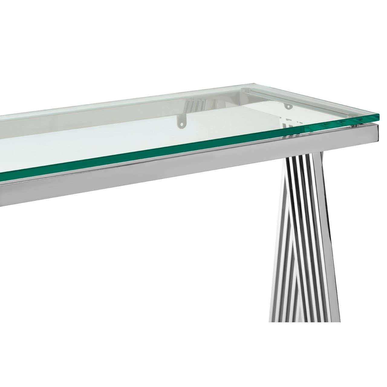 The Piermount console table brings premium design style to interiors. It has a slim silhouette, achieved via its silver finish stainless steel frame. A pane of clear tempered glass is set into the top this table will complement any living space in your home