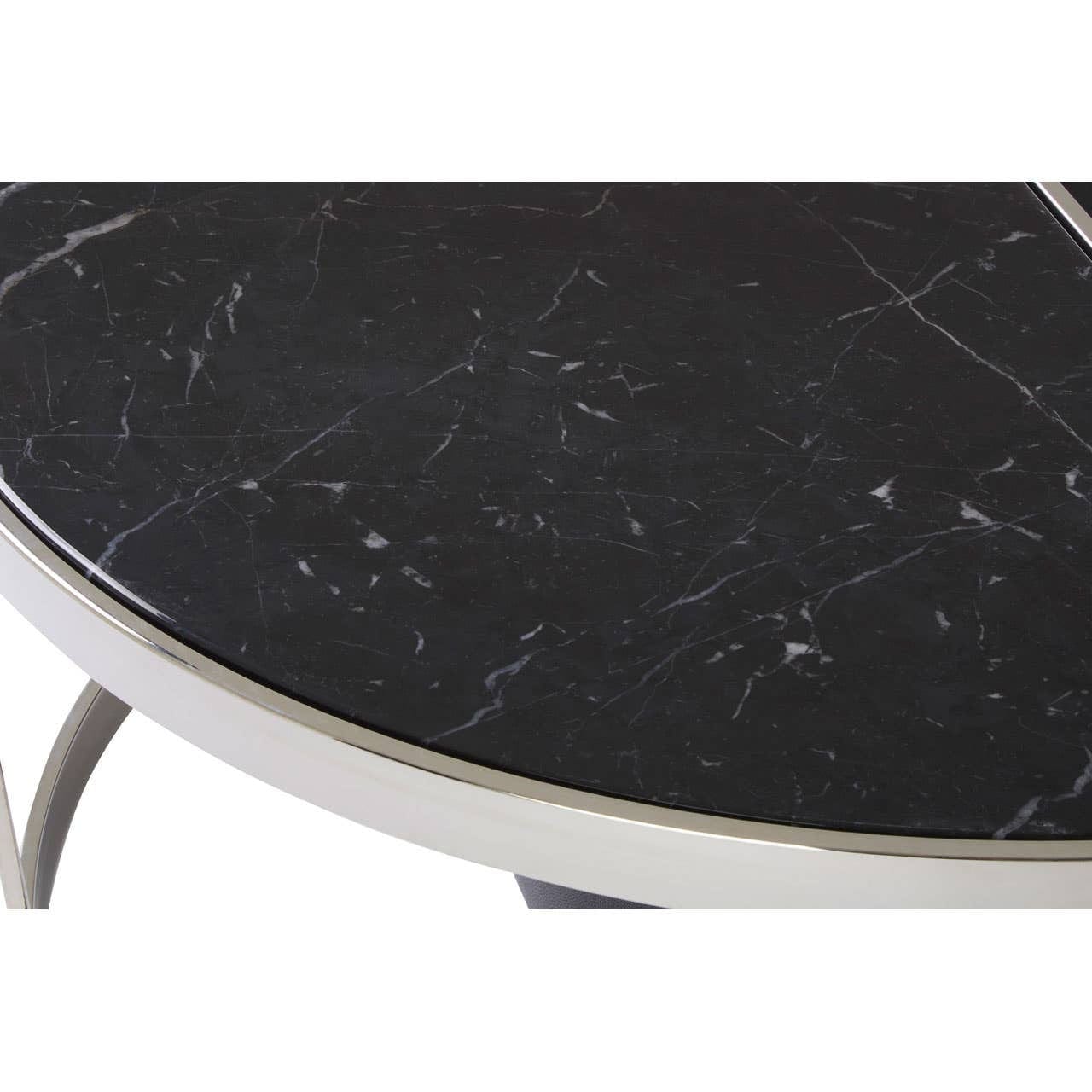 The semicircular coffee table is created from smooth stainless steel with a reflective silver finish, while black marble adds an elegant touch to the table's top. The black faux leather footstool nests comfortable underneath the table when not in use.