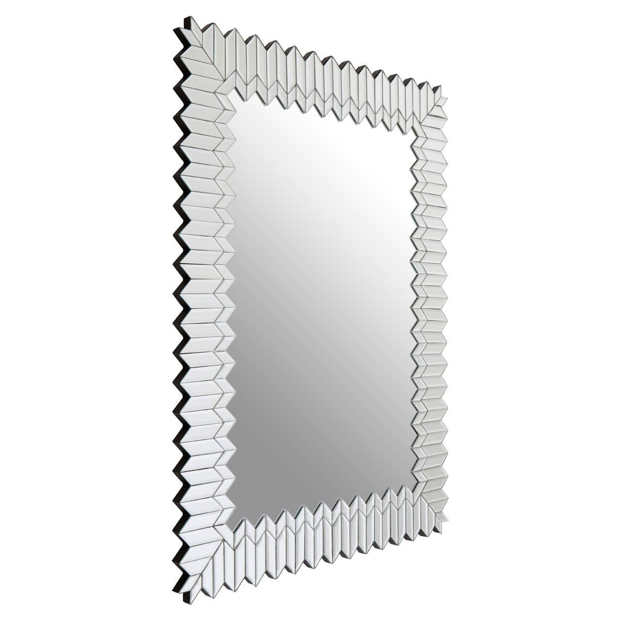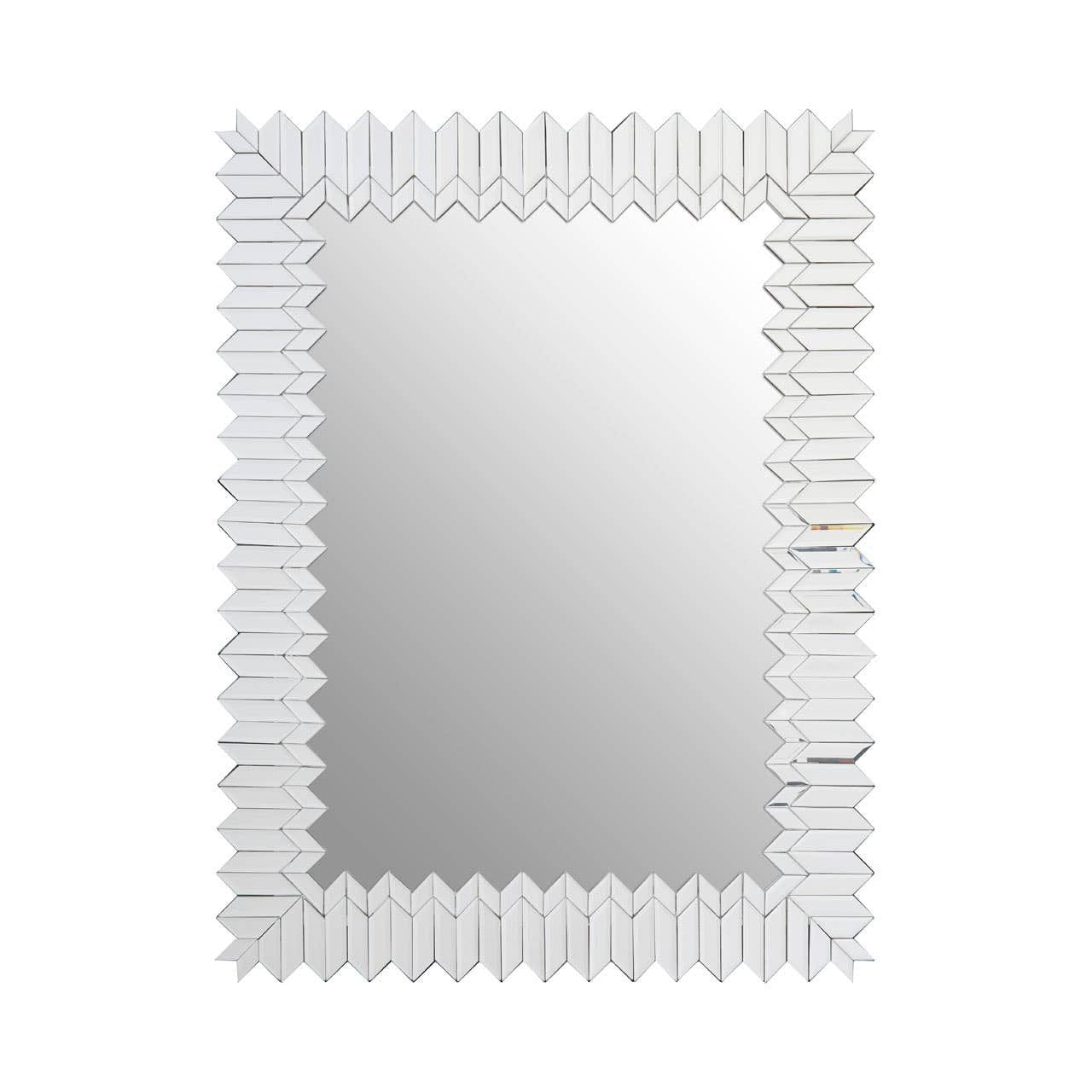 The Rabia wall mirror's frame features small geometric shapes positioned together to create an angular mosaic effect. The frame's serrated edges add a touch of drama and contrast with the smooth surface of the central mirror. Coordinate with geometric shaped furniture and accessories for a complete look.