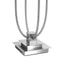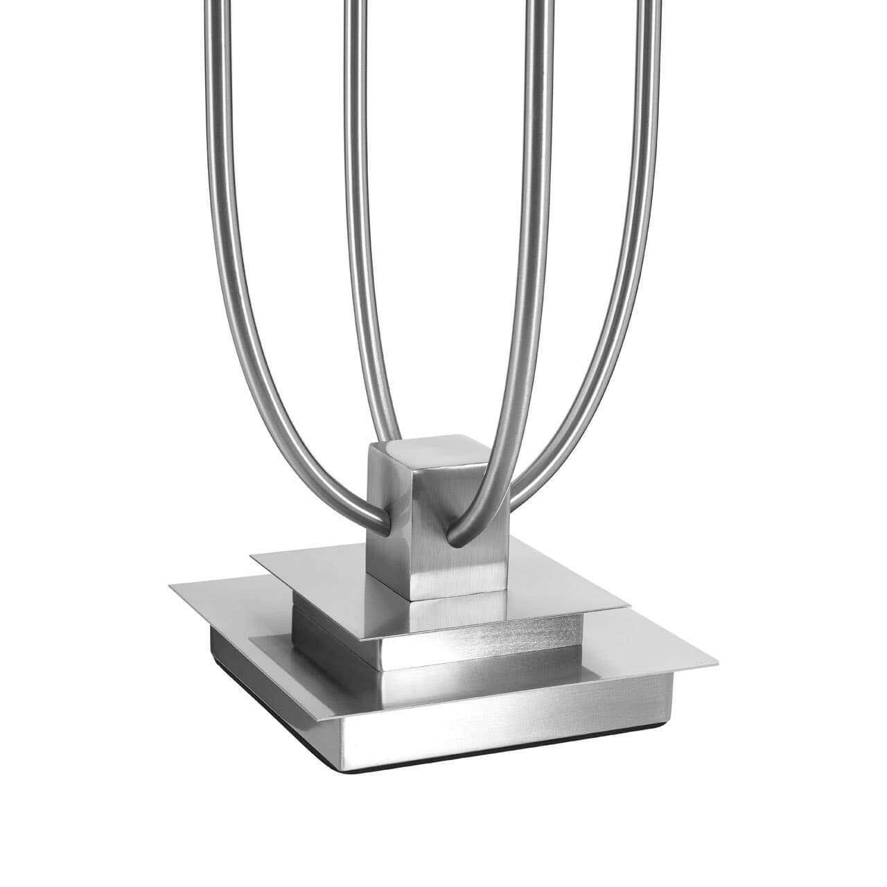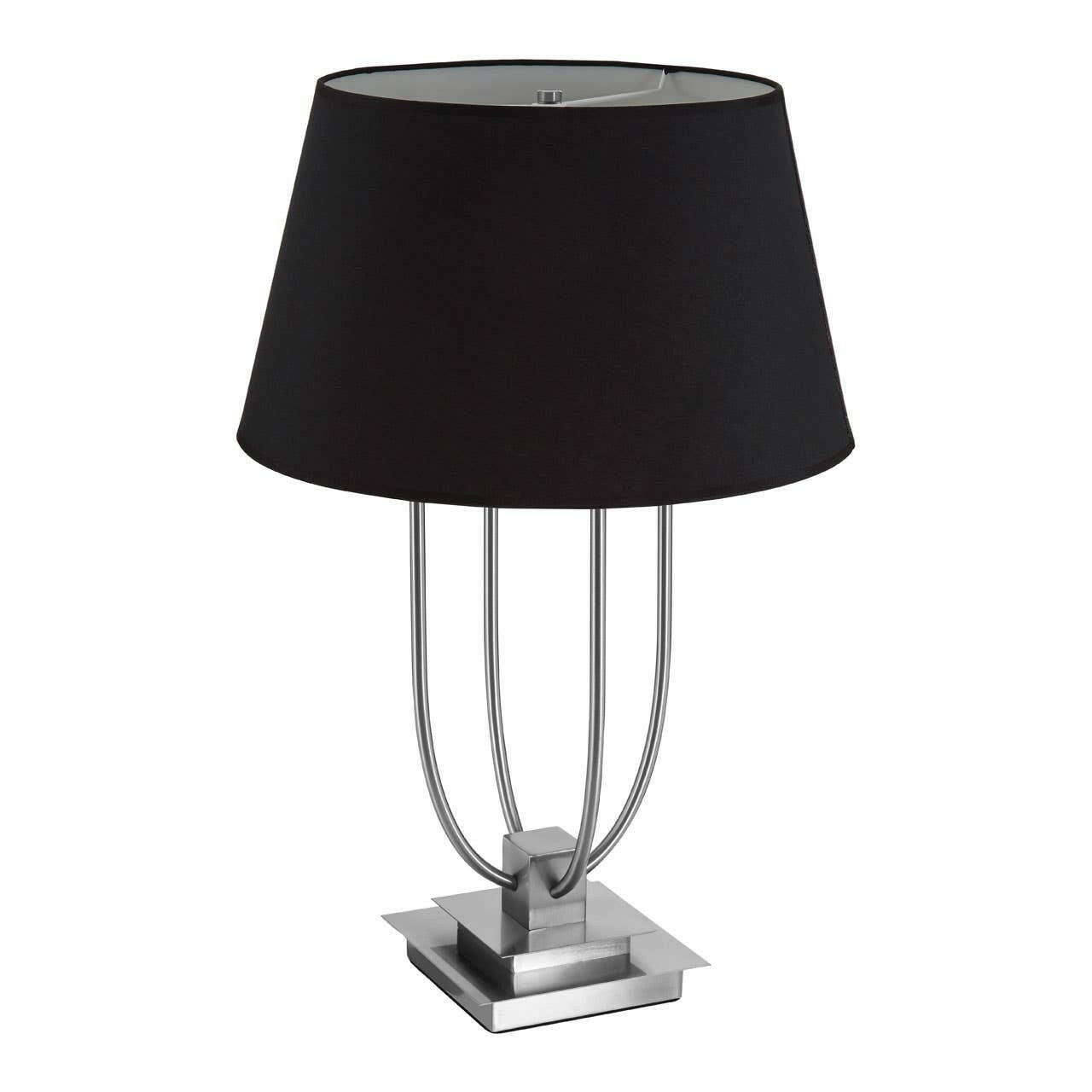 The Regents Park table lamp lends a luxury boutique hotel accent to the living room. Its smooth metal base has a sleek satin nickel finish. Four slender arms extend upwards from the base, their curved design contrasting with the square lines of the base. Its tapering shade is coloured black and diffuses the light softly.