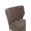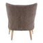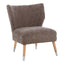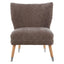 This chair is characterised by its plump cushioning and grey chenille fabric, with modest wingback sides that cradle the sitter's back. The fabric is coloured grey and has a repeated box-shaped pattern that contrasts with the chair's curved lines. Its feet are made from light coloured wood, each one tipped with metal for a reflective finish.